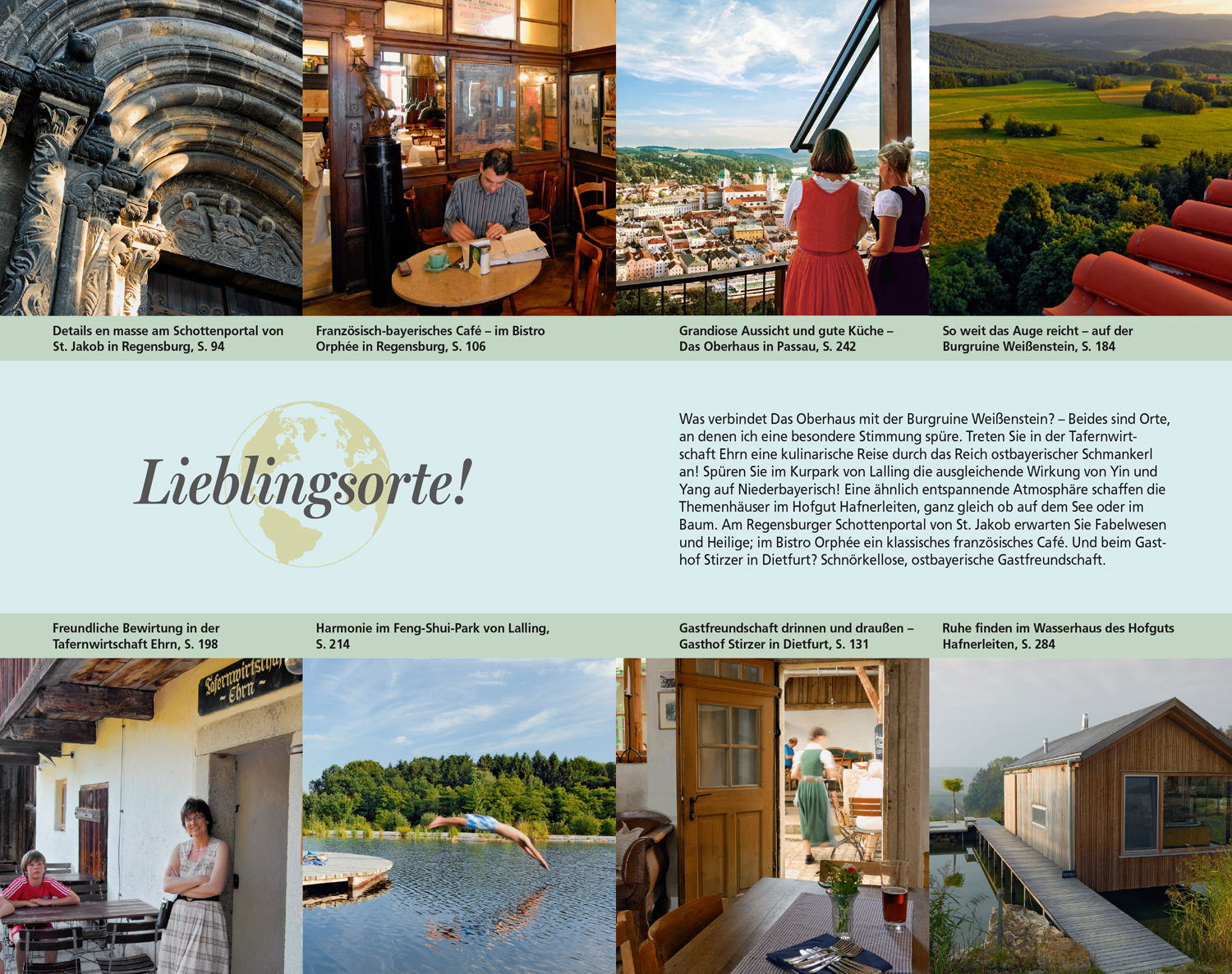 Folgt man einer der zehn speziellen Entdeckungstouren, so kann man am Dreisessel auf den Spuren des Dichters Adalbert Stifters wandeln und den Weitblick nach Tschechien genießen, oder das spektakuläre Granitzentrum in Hauzenberg und das Glasmuseum in Frauenau besuchen. Zu den besonderen Lieblingsorten der Autorin gehören der Feng-Shui- Park in Lalling und der Gasthof Stirzer in Dietfurt im malerischen Flusstal der Altmühl.
