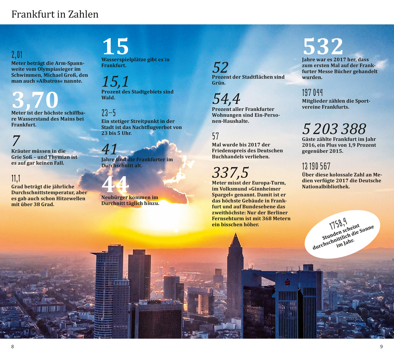 Das Beste zu Beginn. Das ist Frankfurt. Frankfurt in Zahlen. Was ist wo? Augenblicke. Ihr Frankfurt-Kompass: 15 Direktkapitel. Frankfurts Museumslandschaft. Zeitgeschehen. Pause. Einfach mal abschalten. In fremden Betten. Satt & Glücklich. Stöbern & Entdecken. Wenn die Nacht beginnt. Hin & weg. O-Ton Frankfurt. Kennen Sie die?