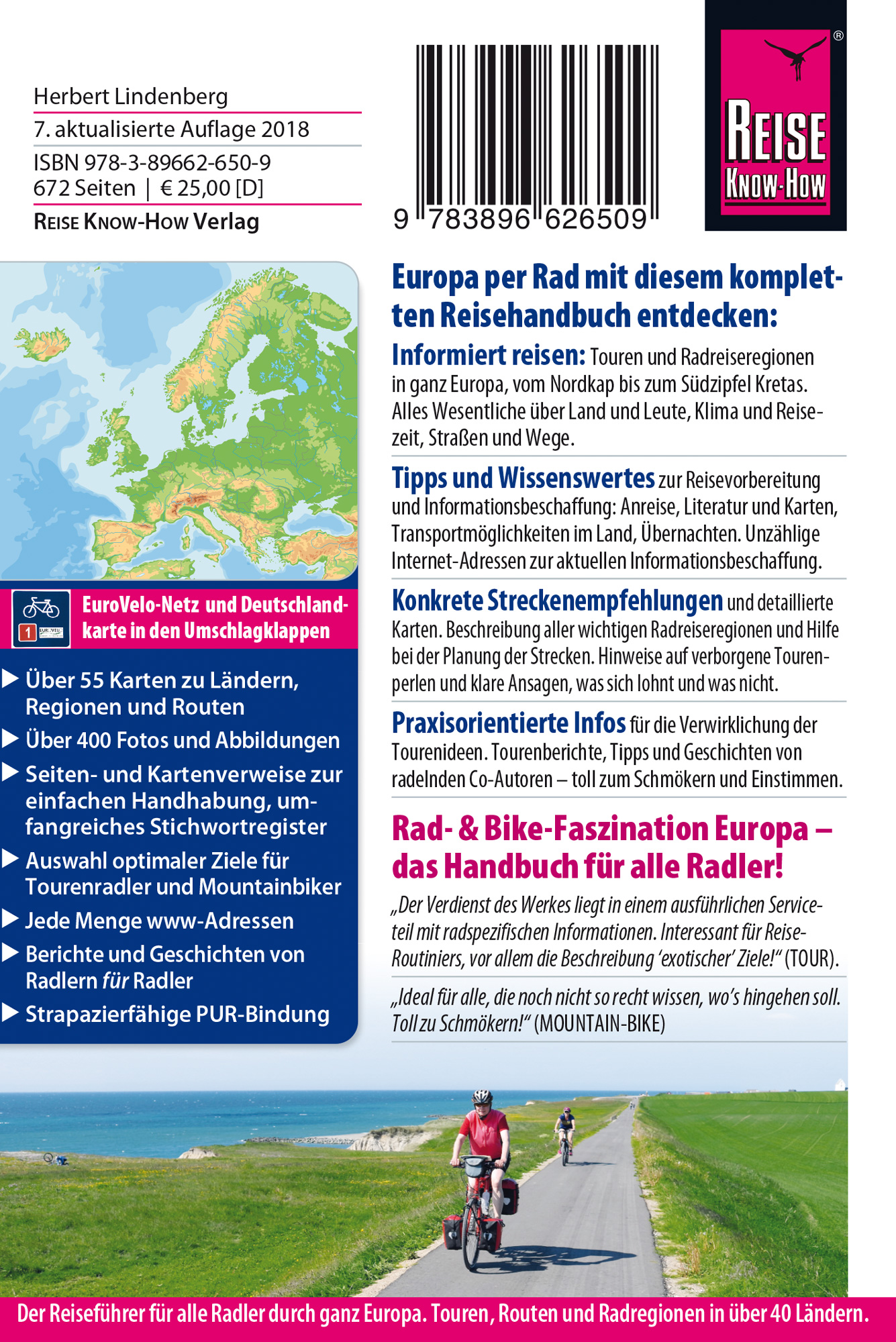 Das optimale Buch, um Radtouren zu planen und zu verwirklichen. 40 europäische Länder werden ausführlich mit einem tourenpraktischen Infoteil vorgestellt: Reisezeit und Wetter - Info-Quellen - Karten und Papiere - Anreise - inländische Verkehrsmittel - Übernachten - Fahrrad - Straßen und Wege. Sonderkapitel, wie z.B. tourenpraktische Hinweise für den Alpenraum mit Pässen, stimmungsvolle Radreise-Stories vieler Co-Autoren lockern das umfangreiche Werk auf.--------- Europa per Rad mit diesem kompletten Reisehandbuch entdecken:- Informiert reisen: Touren und Radreiseregionen in ganz Europa. Vom Nordkap bis zum Südzipfel Kretas. Alles Wesentliche über Land und Leute, Klima und Reisezeit, Straßen und Wege, Radelbedingungen.- Tipps und Wissenswertes zur Reisevorbereitung und Informationsbeschaffung: Anreise, Literatur und Karten, Transportmöglichkeiten im Land, Übernachten. Unzählige Internet-Adressen zur aktuellen Informationsbeschaffung.- Konkrete Streckenempfehlungen und detaillierte Karten. Beschreibung aller wichtigen Radreiseregionen und Hilfe bei der Planung konkreter Strecken. Hinweise auf verborgene Tourenperlen und klare Ansagen, was sich lohnt und was nicht. Auswahl optimaler Ziele für Tourenradler und Mountainbiker.- Praxisorientierte Infos für die Verwirklichung der Tourenideen. Tourenberichte, Tipps und Geschichten von radelnden Co-Autoren - toll zum Schmökern und Einstimmen. ----------- Mit Touren durch: Albanien, die Alpen, Baltikum (Litauen, Lettland, Estland), Belgien, Bosnien-Herzegowina, Bulgarien, Dänemark, Deutschland, Färöer, Finnland, Frankreich, Griechenland, Großbritannien (England, Wales, Schottland), Irland (Republik Irland, Nordirland), Island, Italien, Kosovo, Kroatien, Luxemburg, Malta, Mazedonien, Montenegro, Niederlande, Norwegen, Osteuropa (Weißrussland, Ukraine, Moldawien, Russland), Österreich, Polen, Portugal, Rumänien, Schweden, Schweiz, Serbien, Slowakei, Slowenien, Spanien, Tschechien, Türkei (europäischer Teil), Ungarn, Zypern.--------- Ausstattung: komplett in Farbe, mehr als 50 Karten zu Ländern, Regionen und Routen; EuroVelo-Netz und Deutschlandkarte in den Umschlagklappen; über 280 Abbildungen und Fotos; Kartenverweise zur einfachen Handhabung; umfangreiches Register; strapazierfähige PUR-Bindung.