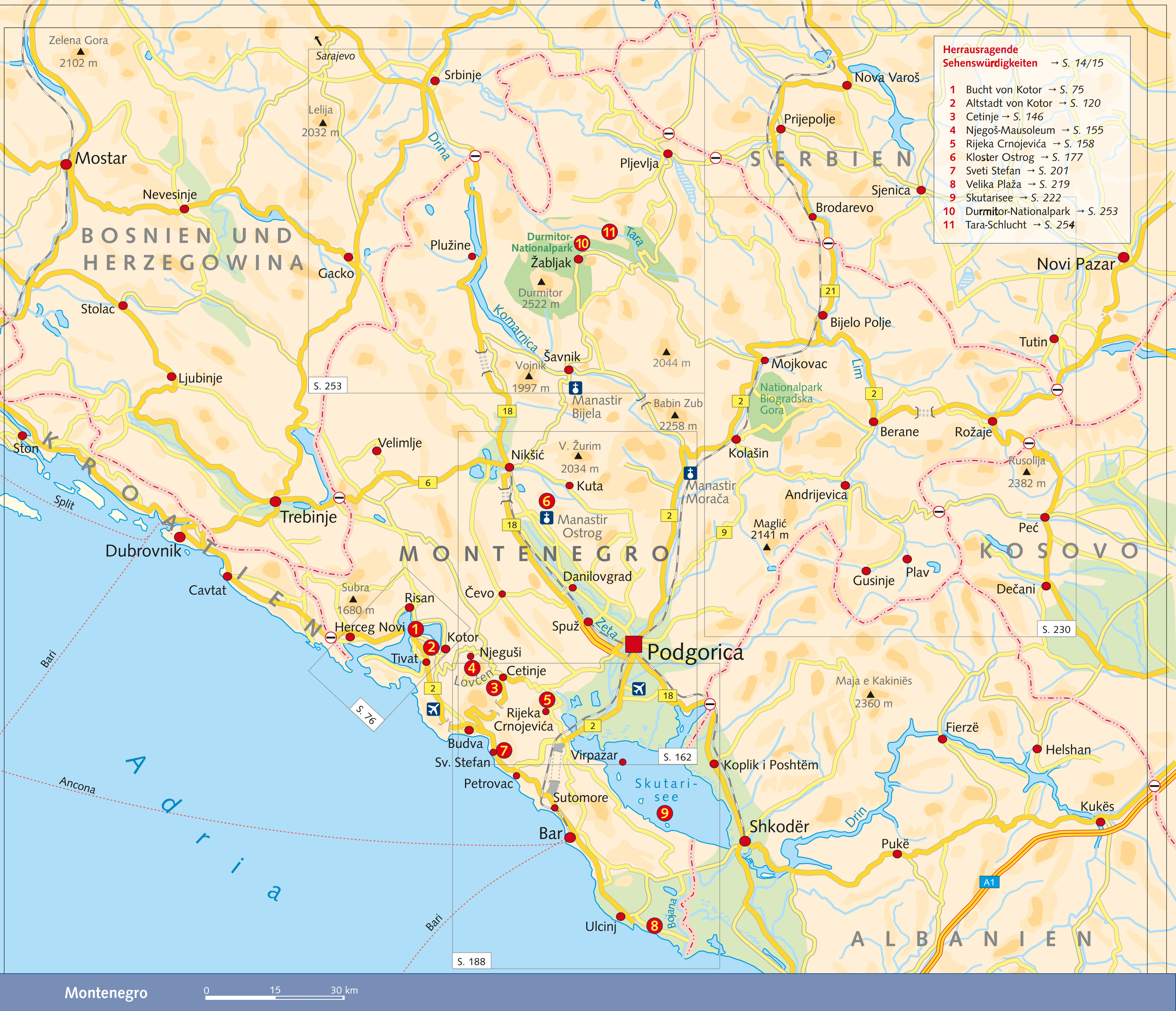 Die meisten Gäste zieht es nach wie vor an die Küste. Budva mit seiner von einer Stadtmauer umgebenen Altstadt, dem königlichen Strand und der HotelinselSveti Stefan versetzt die Besucher in Verzückung. Sie staunen in der Bucht von Kotor über einen einzigartigen Fjord und kommen der Geschichte des Landesin der von der UNESCO zum Weltkulturerbe erklärten Altstadt von Kotor näher. Aber auch fern der touristischen Küstenorte erlaubt Montenegro tiefe Einblicke in seine Ursprünge und eine von verschiedenen Kulturen geprägte ereignisreiche Geschichte. In der alten Residenzstadt Cetinje etwa scheint die Zeit stehen geblieben zu sein.