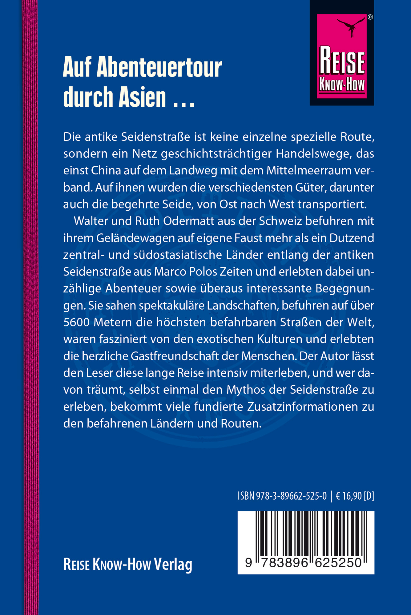 Walter und Ruth Odermatt aus der Schweiz befuhren mit ihrem Geländewagen auf eigene Faust mehr als ein Dutzend zentral- und südostasiatische Länder entlang der antiken Seidenstraße aus Marco Polos Zeiten und erlebten dabei unzählige Abenteuer sowie überaus interessante Begegnungen. Sie sahen spektakuläre Landschaften, befuhren auf über 5600 Metern die höchsten befahrbaren Straßen der Welt, waren fasziniert von den exotischen Kulturen und erlebten die herzliche Gastfreundschaft der Menschen. Der Autor lässt den Leser diese lange Reise intensiv miterleben, und wer davon träumt, selbst einmal den Mythos der Seidenstraße zu erleben, bekommt viele fundierte Zusatzinformationen zu den befahrenen Ländern und Routen.