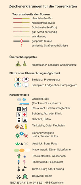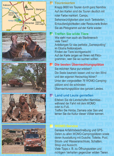 TOURENKARTENKnapp 9000 km Touren durch ganz Namibia. Auf den Karten sind die Touren deutlich mit roter Farbe markiert. Camps, Sehenswürdigkeiten aber auch Tankstellen; Einkaufsmöglichkeiten oder Restaurants finden Sie als Piktogramm auf der Karte wieder. TREFFEN SIE WILDE TIEREWie sieht man auch als Stadtmensch viele Tiere? Anleitungen für das perfekte "Gamespotting" im Etosha Nationalpark. Finden der Tiere leichtgemacht; Auf der Karte zeigen wir Ihnen mit Piktogrammen, wen Sie wo suchen sollten. DIE BESTEN ÜBERNACHTUNGSPLÄTZESie möchten Natur par erleben? Die Seele baumeln lassen und nur den Wind und den eigenen Herzschlag hören? Unter den vorgestellten 76 WOMO-Campingplätzen sind die schönsten Übernachtungsplätze des ganzen Landes. LAND UND LEUTE GENIESSENErleben Sie die Landschaften Namibias - während der Fahrt mit dem WOMO oder zu Fuß.Treffen Sie Himba, Damara oder San und lernen Sie die Kultur dieser Völker kennen. WOMO-SERVICEGenaue Anfahrtsbeschreibung und GPS-Daten zu allen WOMO-Campingplätzen sowie deren Ausstattung mit Dusche, Toilette, Pool, Strom- und Wasseranschluss, Schatten, Shop und Aussicht. Viele Tipps z.B. zu Öffnungszeiten und richtigem Verhalten gegenüber wilden Tieren.