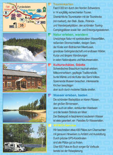 Fast 8000 km durch den Norden Schwedens in 14 sorgfältig recherchierten Touren. Übersichtliche Tourenkarten mit der Tourstrecke (rot markiert), den Stell-, Bade-, Picknick- und Wanderparkplätzen, den schönsten Touring- Campingplätzen sowie Ver- und Entsorgungsstationen.