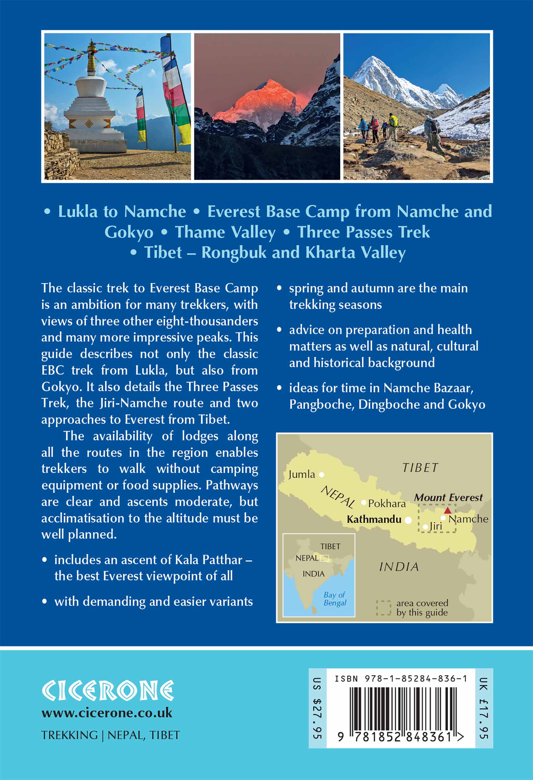 The guidebook includes suggestions for side trips and time spent in Namche Bazaar, Pangboche, Dingboche and Gokyo, as well as two treks approaching Everest from Tibet - Tingri to Rongbuk Everest Base Camp and from Kharta to the Kangshung Face.