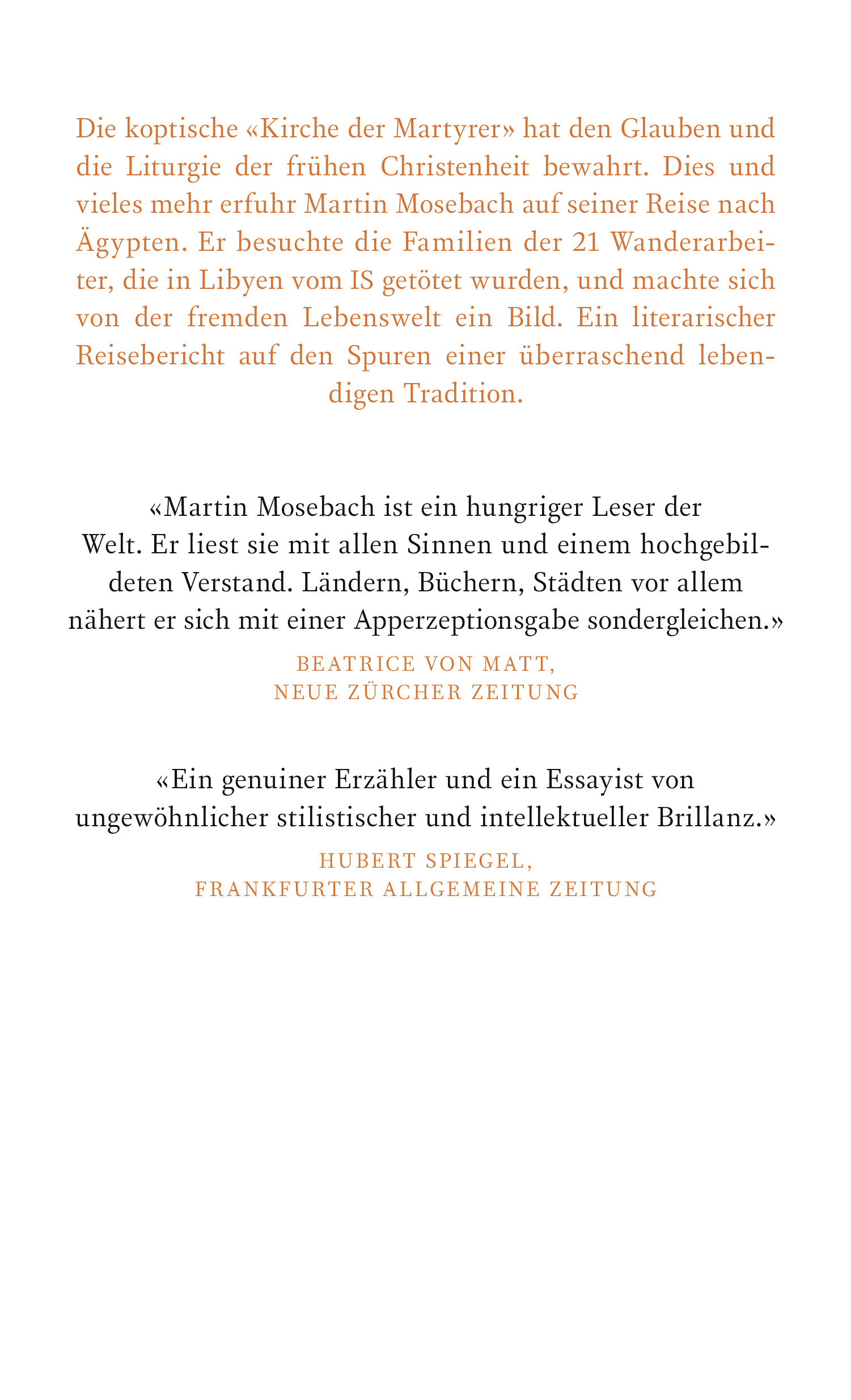 Martin Mosebach hat ein Reisebuch geschrieben über seine Begegnung mit einer fremden Gesellschaft und einer Kirche, die den Glauben und die Liturgie der frühen Christenheit bewahrt hat - der «Kirche der Martyrer», in der das irdische Leben von der himmlischen Sphäre nur wie durch ein Eihäutchen geschieden ist. Er traf den Bischof und die koptischen Geistlichen der 21 Wanderarbeiter, besuchte ihre Kirchen und Klöster. In den Zeiten des Kampfes der Kulturen sind die Kopten als Minderheit im muslimischen Ägypten zu einem politischen Faktor geworden - und zu einer Art religiösen Gegengesellschaft. Damit ist dieses Buch auch ein Bericht aus dem Innenleben eines arabischen Landes zwischen biblischer Vergangenheit und den Einkaufszentren von Neu-Kairo.
