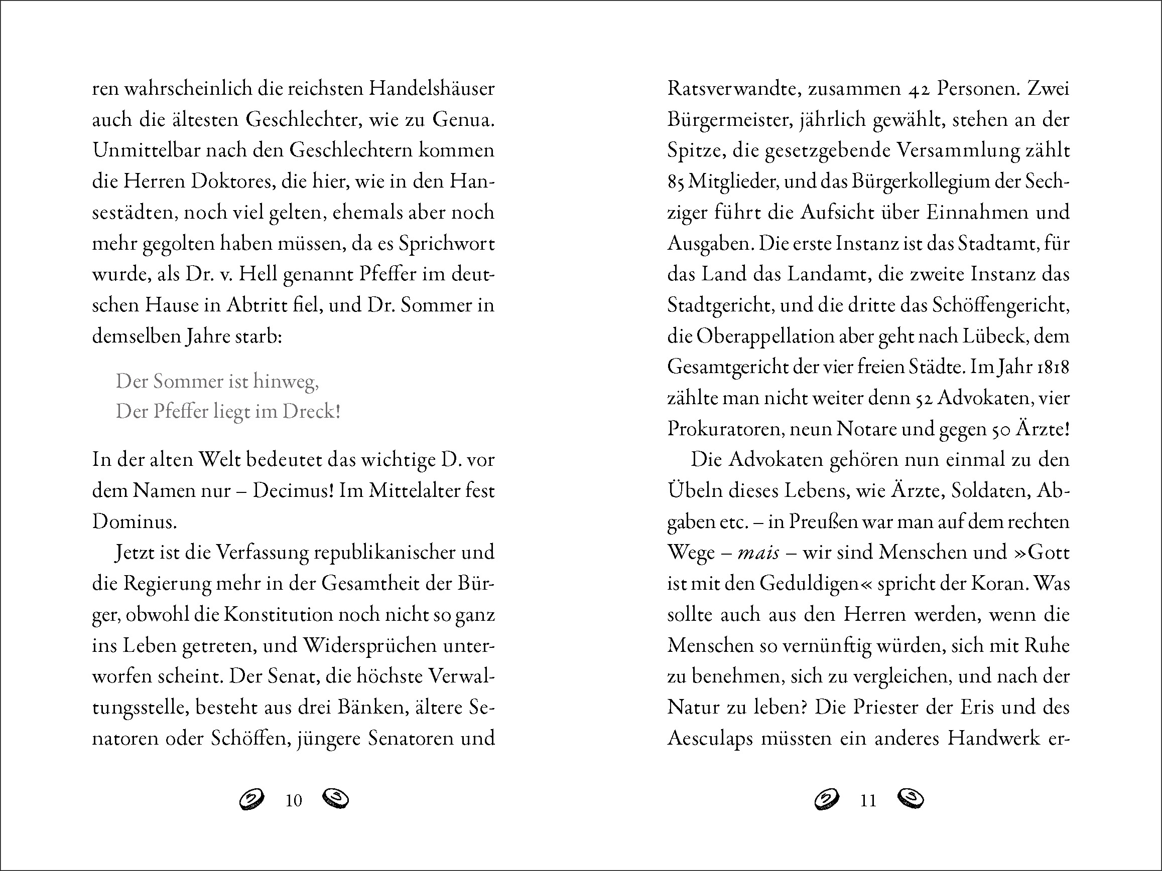 »Die Frankfurter sind ... wegen Höflichkeit nie verschrien gewesen.« Carl Julius WeberCarl Julius Weber ist Mitte des 19. Jahrhunderts als Schriftsteller, insbesondere jedoch als Satiriker bekannt. Wen wundert es also, wenn er in seinem vierbändigen Werk »Deutschland oder Briefe eines in Deutschland reisenden Deutschen« sprichwörtlich kein Blatt vor dem Mund nimmt, wenn es um die Beschreibung von Städten wie Frankfurt am Main geht: »Der Römer oder das Rathaus besteht aus drei altfränkischen Giebelhäusern, so finster und schlecht von außen und so labyrinthisch im Innern, dass kein Fremdling das Rathaus einer so berühmten Stadt leicht erkennen wird.« Und auch die Einwohner der Messestadt werden nicht geschont. »Frankfurter lieben die Spanferkel, und ich habe mehr Lobreden auf die ihre gut und rösch gebratene Keule gehört, als auf Deutschland.« Beste Lektüre und das nicht nur für Frankfurter.