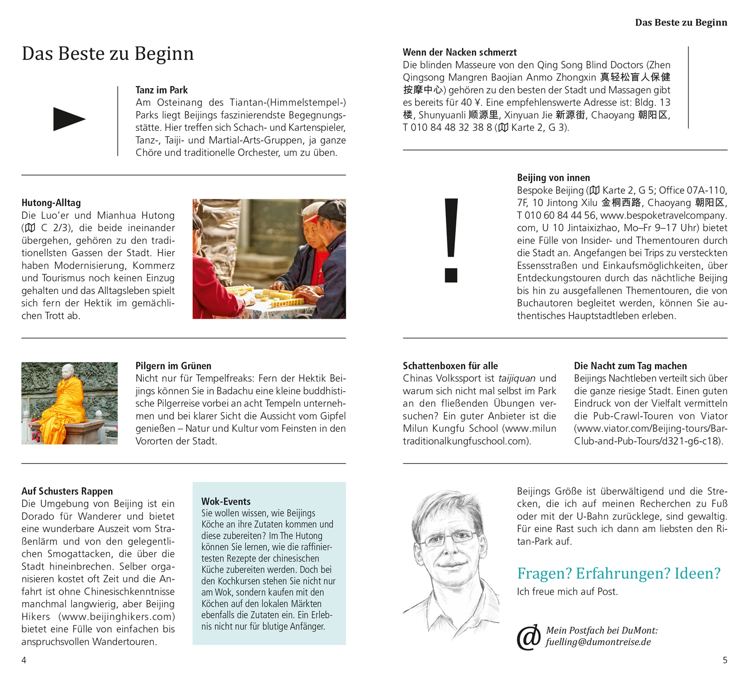 Das Beste zu Beginn. Das ist Beijing. Beijing in Zahlen. Was ist wo? Augenblicke. Ihr Beijing-Kompass: 15 Direktkapitel: Beijinger Museumslandschaft. Beijings Tempel. Beijinger Grab- und Gedenkstätten. Pause - einfach mal abschalten. In fremden Betten. Satt & glücklich. Stöbern & entdecken. Wenn die Nacht beginnt. Hin & weg. O-Ton Beijing. Kennen Sie die?