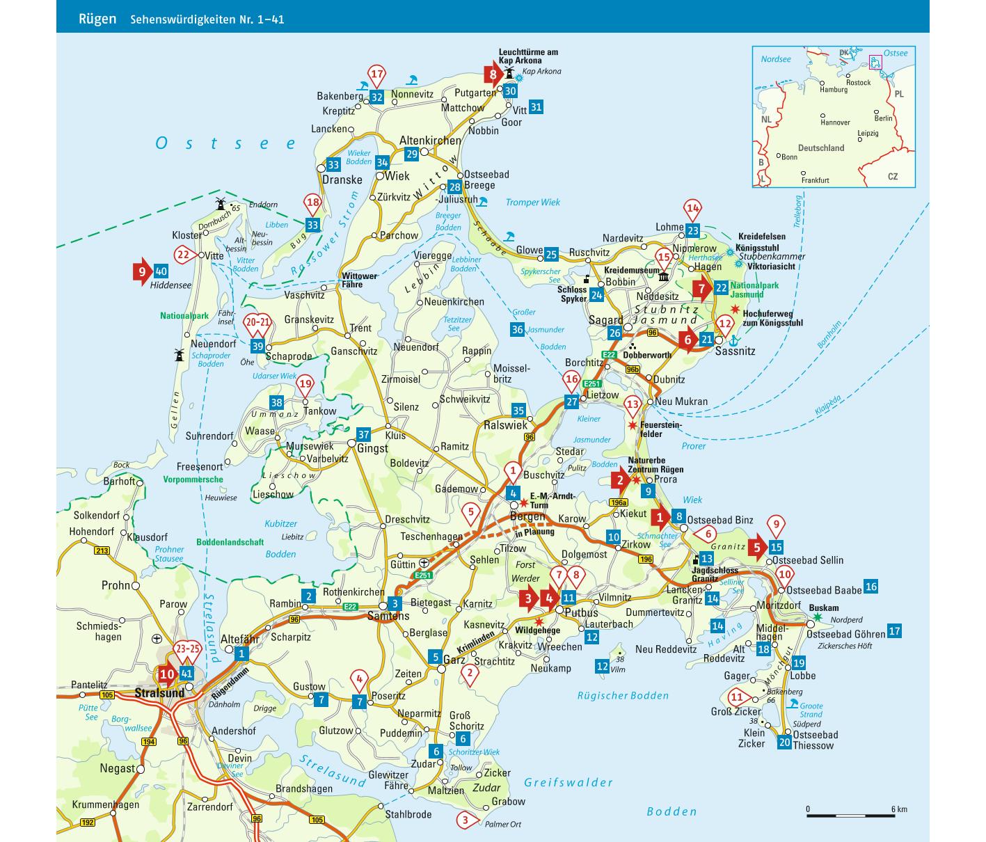 Als hätte hier ein Künstler seinen Pinsel geschwungen, so malerisch ist Rügen. Deutschlands größte Insel fasziniert mit ihren Kreidefelsen, Bädervillen, lauschigen Alleen und Leuchttürmen. Zwischen Kap Arkona und der Hansestadt Stralsund findet jeder sein Plätzchen - ob im abendlichen Trubel von Binz oder an der einsamen Boddenküste. Nostalgiker zuckeln mit dem "Rasenden Roland" von Putbus nach Göhren, Schatzsucher buddeln nach Bernstein, Vogelfreunde beobachten Kraniche - und zum Sonnenuntergang treffen sich alle am Ostseestrand. Auch ein Ausflug auf die autofreie Nachbarinsel Hiddensee darf natürlich nicht fehlen.