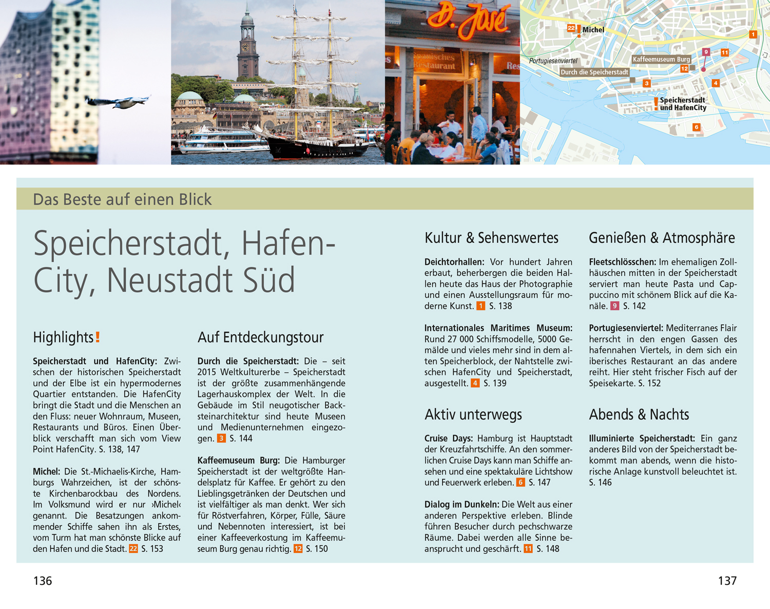 Hamburg persönlich. Reiseinfos, Adressen, Websites. Magazinteil (Panorama) mit Daten, Essays, Hintergründen. Jungfernstieg, Binnenalster und Neustadt. Mönckebergstraße und Altstadt. Speicherstadt, Hafencity und Neustadt Süd. St. Pauli, Reeperbahn, Elbufer. Schanzen- und Karolinenviertel. Rotherbaum, Harvestehude, Grindel. Hoheluft und Eppendorf. St. Georg. Altona und Ottensen. Von Övelgönne nach Blankenese. 39 Karten und Pläne plus eine separate Reisekarte im Maßstab 1:20.000.