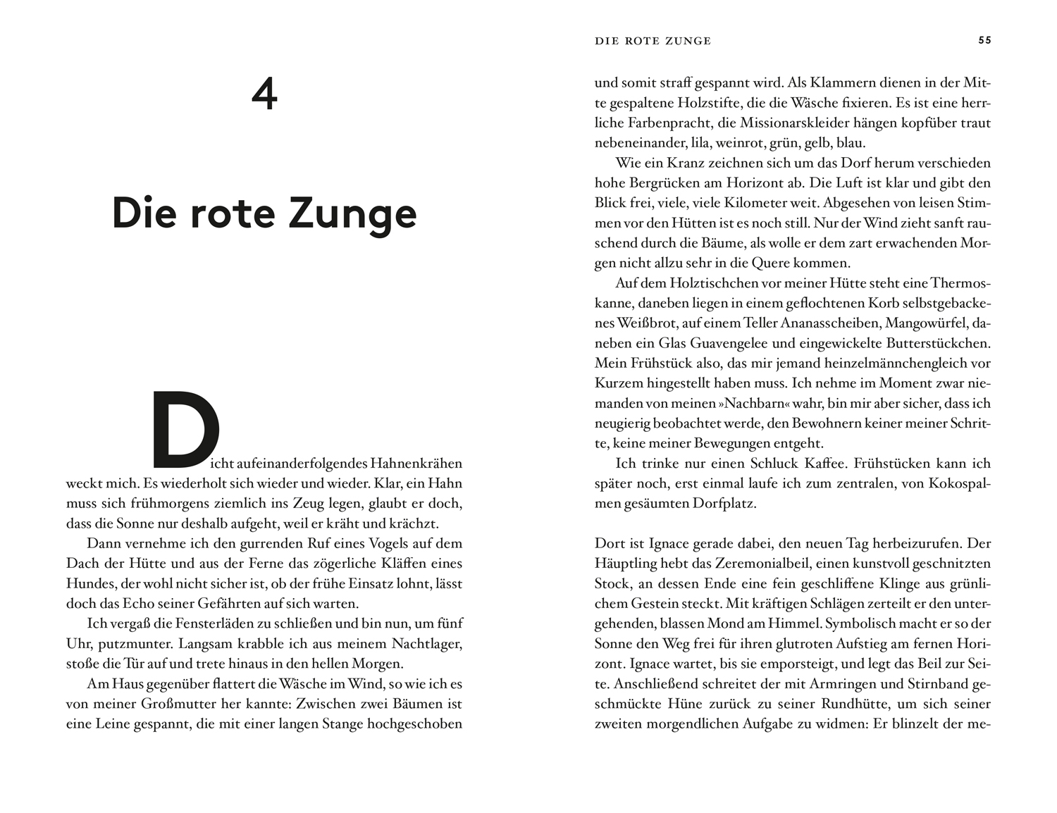 Kurz bevor Birgit Weidts Großvater starb, vermachte er ihr eine Maske aus Holz, ein uraltes Geschenk aus Neukaledonien. Jahre später begibt sich die Berlinerin dort auf die Suche nach den Geschichten hinter ihrem "Schutzengel". Auf dem Archipel am anderen Ende der Welt taucht sie ein in die fremde, indigene Welt der Insulaner, die so gar nichts mit der ihrigen gemeinsam zu haben scheint. Eine Welt, in der Schamanen die Zukunft aus Palmblättern voraussagen, Kleider sich bei Regen in Luft auflösen und Häuptlinge senkrecht begraben werden, der Kopf aus der Erde ragend. Eine Welt, in der die Ahnen allgegenwärtig sind, die Unterschiede zwischen Männern und Frauen anhand von Wurzeln erklärt werden und Frauen ihre Altersfalten tragen wie kostbaren Schmuck. Und erst als sie zurückgekehrt ist, bemerkt sie, wie ihre Reise ihren Blick auf die eigenen Ahnen und auf sich selbst verändert hat.