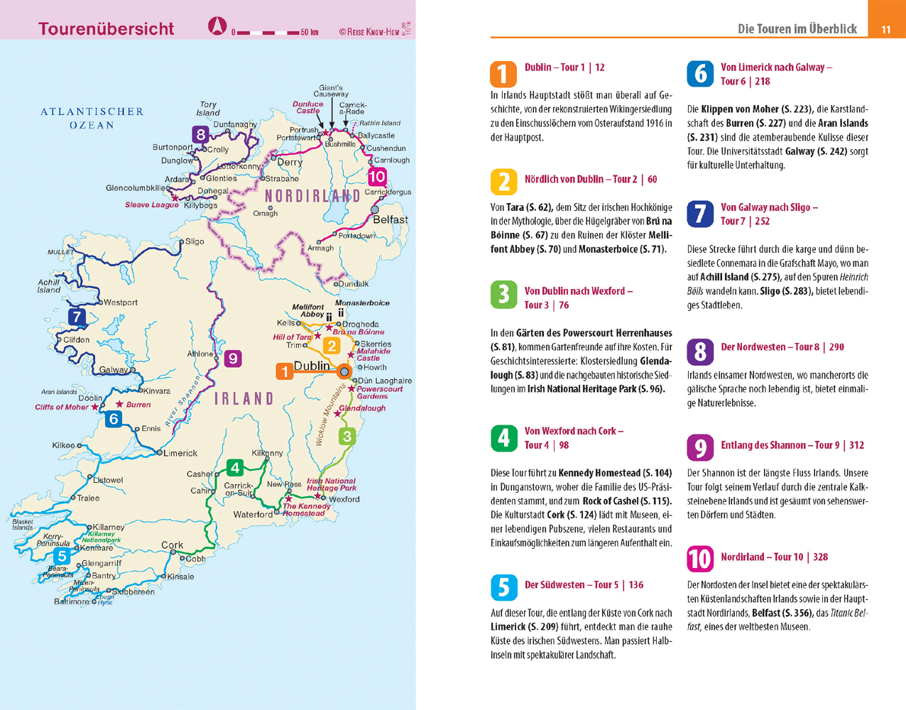 InhaltVorwort 4Exkursverzeichnis 8Kartenverzeichnis 9Die Touren im Überblick 11Dublin - Tour 1 Dublin 14Halbinsel Howth 56Nördlich von Dublin - Tour 2 Hügel von Tara 62Trim 64Kells 65Brú na Bóinne 67Mellifont Abbey 70Monasterboice 71Drogheda 73Skerries 74Malahide Castle 75Von Dublin nach Wexford - Tour 3Dún Laoghaire 78Wicklow Mountains 80Das Tal von Glendalough 83Wexford 91Von Wexford nach Cork - Tour 4 New Ross 100Waterford 105Carrick-on-Suir 107Kilkenny 109Cashel 114Cahir 117Nach Cork 118Cobh 119Cork 124Der Südwesten - Tour 5 Kinsale 138Skibbereen 144Lough Hyne 145Baltimore 146Mizen-Pensinsula 148Bantry 151Glengarriff 153Der Ring of Beara 155Kenmare 161Killarney 163Der Ring of Kerry 180Dingle-Peninsula 192Die Blasket Islands 195Tralee 204Listowel 206Kilkee 208Limerick 209Von Limerick nach Galway - Tour 6 Ennis 221Cliffs of Moher 223Doolin 225Der Burren 227Die Aran-Inseln 231Kinvara 238Galway 242Von Galway nach Sligo - Tour 7 Nach Clifden 254Clifden 263Nach Westport 267Westport 273Achill Island 275Halbinsel Mullet 282Sligo 283Der Nordwesten - Tour 8 Donegal 294Killybegs 295Slieve League 296Glencolmcille 298Ardara 299Dunglow 300Burtonport 300Arranmore 300Crolly 302Tory Island 302Inishbofin 303Dunfanaghy 303Fanad-Peninsula 304Letterkenny 306Glenties 309Entlang des Shannon - Tour 9 Der Shannon 317Bootsfahrt von Nord nach Süd 318Nordirland - Tour 10 Derry 330Portstewart 344Portrush 344Dunluce Castle 345Bushmills 347Giant's Causeway 348Die Hängebrücke vonCarrick-a-Rede 349Ballycastle 350Rathlin Island 352Cushendun 353Carnlough 354Carrickfergus 354Belfast 356Armagh 378Praktische Reisetipps A - Z An- und Rückreise 386Arbeiten oder studieren in Irland 390Einkaufen 392Ein- und Ausreisebestimmungen 394Elektrizität 395Feiertage und Ferien 396Geldfragen 398Gesundheit 399Informationen 400Kriminalität 401Maße und Gewichte 402Notfälle 402Post und Telefon 404Rauchen 404Reisezeit 405Toiletten 405Unterwegs in Irland 405Unterkunft 412Urlaubsaktivitäten 416Verpflegung 421Zeitdifferenz 429Zeitungen 429Land und Leute Geografie 432Klima 432Flora 434Fauna 438Umweltschutz 442Bevölkerung 445Bildungswesen 447Irische Sportarten 450Medien 452Staat und Verwaltung 454Wirtschaft 458Tourismus 464Religion 465Die irische Sprache 470Baukunst 471Irische Musik 475Daten zur Geschichte 476Anhang Literaturtipps 494Ortsnamen Englisch - Irisch,Irisch -Englisch 495Register 496Der Autor 504Redakteure dieser Auflage 504