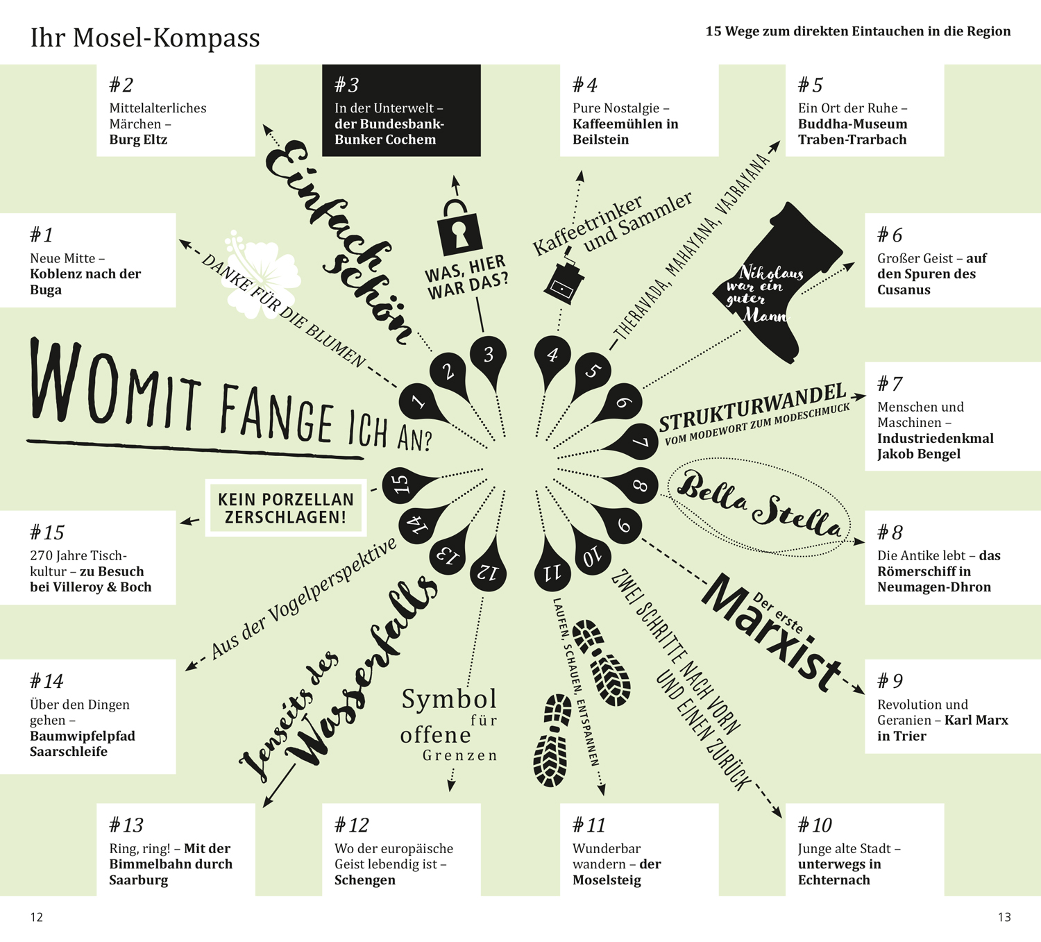 Das Beste zu Beginn. Das ist die Mosel. Die Mosel in Zahlen. So schmeckt die Mosel. Ihr Mosel-Kompass: Koblenz und die Terrassenmosel. Die Mittelmosel. Trier und die Obermosel. Im Dreiländereck. Hin & weg. O-Ton Mosel. Kennen Sie die?
