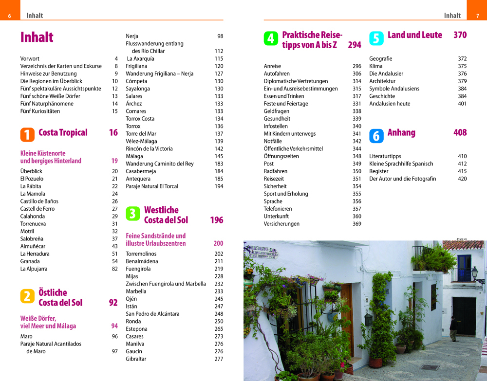 Inhalt: Vorwort 4Verzeichnis der Karten und Exkurse 8Hinweise zur Benutzung 9Die Regionen im Überblick 10Fünf spektakuläre Aussichtspunkte 12Fünf schöne Weiße Dörfer 13Fünf Naturphänomene 14Fünf Kuriositäten 15Costa Tropical ..................... 16Kleine Küstenorte und bergiges Hinterland 19Überblick 20El Pozuelo 21La Rábita 22La Mamola 24Castillo de Baños 26Castell de Ferro 27Calahonda 29Torrenueva 31Motril 32Salobreña 37Almuñécar 43La Herradura 51Granada 54La Alpujarra 82Östliche Costa del Sol ..................... 92Weiße Dörfer, viel Meer und Málaga 94Maro 96Paraje Natural Acantilados de Maro 97Nerja 98Flusswanderung entlang des Río Chillar 112La Axarquía 115Frigiliana 120Wanderung Frigiliana - Nerja 127Cómpeta 130Sayalonga 130Salares 133Árchez 133Comares 133Torrox Costa 134Torrox 136Torre del Mar 137Vélez-Málaga 139Rincón de la Victoria 142Málaga 145Wanderung Caminito del Rey 183Casabermeja 184Antequera 185Paraje Natural El Torcal 194Westliche Costa del Sol ..................... 196Feine Sandstrände und illustre Urlaubszentren 200Torremolinos 202Benalmádena 211Fuengirola 219Mijas 228Zwischen Fuengirola und Marbella 232Marbella 233Ojén 245Istán 247San Pedro de Alcántara 248Ronda 250Estepona 265Casares 273Manilva 276Gaucín 276Gibraltar 277Praktische Reisetipps von A bis Z ..................... 294Anreise 296Autofahren 306Diplomatische Vertretungen 314Ein- und Ausreisebestimmungen 315Essen und Trinken 317Feste und Feiertage 331Geldfragen 338Gesundheit 339Infostellen 340Mit Kindern unterwegs 341Notfälle 342Öffentliche Verkehrsmittel 344Öffnungszeiten 348Post 349Radfahren 350Reisezeit 351Sicherheit 354Sport und Erholung 355Sprache 356Telefonieren 357Unterkunft 360Versicherungen 369Land und Leute ..................... 370Geografie 372Klima 375Die Andalusier 376Architektur 379Symbole Andalusiens 384Geschichte 384Andalusien heute 401Anhang ..................... 408Literaturtipps 410Kleine Sprachhilfe Spanisch 412Register 415Der Autor und die Fotografin 420Exkurse:Francisco Ramírez de Madrid 38Wo der Maurenherrscher weinte 56Los Moriscos - die zwangskonvertierten Moslems 118Los Chiringuitos - eine andalusische Institution 206Vom Seat 600 zur Generation Golf 223Warum die Stiere nicht mehr am Schwanz gezogen werden - die Stierkampfschule von Ronda 259Blas Infante 274Über die Meerenge ins "gelobte Land": espaldas mojadas 280Paella - ein Arme-Leute-Gericht 322Who is who - Gambas & Co. 325Die Bar - das Wohnzimmer des Spaniers 326¡Bendita sea la madre que te parió! 378Kolonialmacht Spanien - die Reste eines Weltreichs 388Einmal Gott spielen - Spanien und Portugal im Eroberungsrausch 394Begriffe aus al-Andalus 396Geliebt und verpönt - der Kampf mit den Stieren 404
