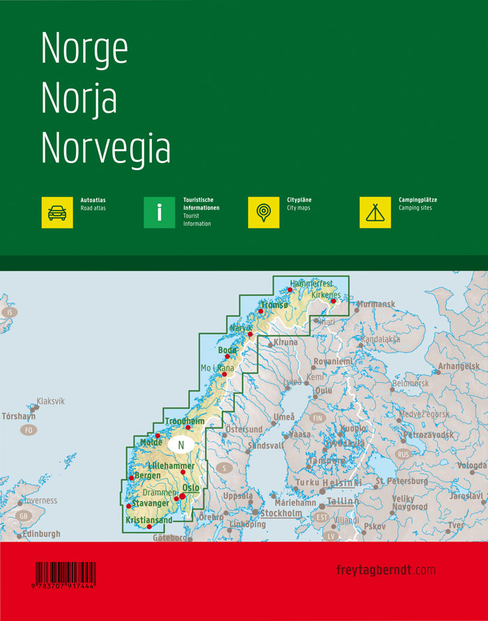Neben der übersichtlichen Gestaltung verfügt der Straßenatlas Norwegen 1:250.00 - 1:400.000 über zahlreiche Zusatzinformationen wie z.B. Straßenbeschaffenheit, Sehenswürdigkeiten, Campingplätze und diverse Innenstadtpläne. Mit dem umfangreichen Ortsregister gelingt zudem eine rasche Orientierung. Touristische Informationen, Ortsregister mit Postleitzahlen, Entfernungen in km, Campingplätze und Stellplätze, Citypläne: Bodø, Bergen, Hammerfest, Kristiansand, Narvik, Stavanger, Oslo, Trondheim; freytag & berndt Autoatlanten sind für viele Länder und Regionen weltweit erhältlich.