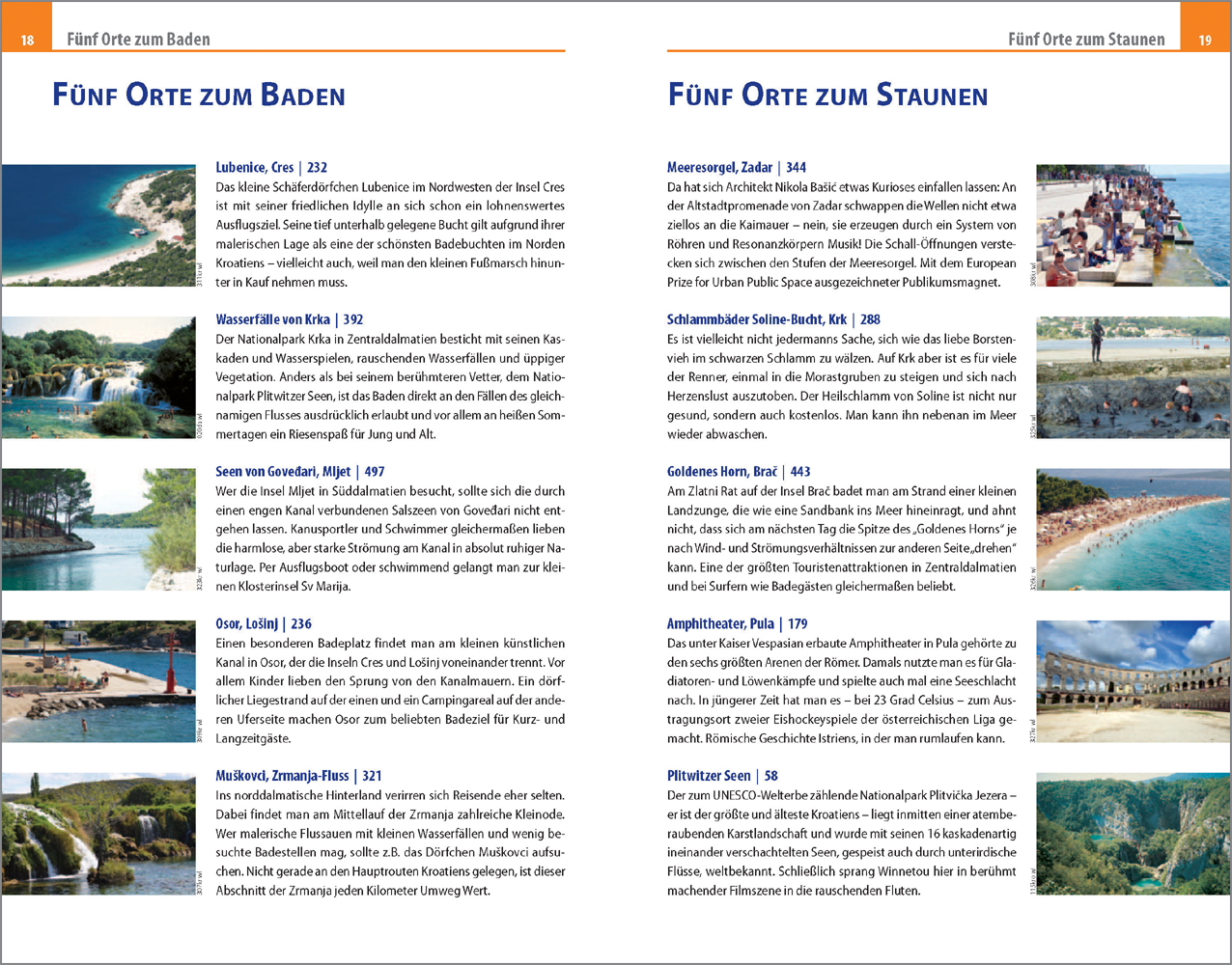 Folgen Sie dem Autor in die prachtvollen Gassen der Altstadt von Dubrovnik. Nutzen Sie Zagrebs Standseilbahn, um von der Oberstadt einen schönen Rundumblick auf Kroatiens Hauptstadt zu genießen. Probieren Sie in einer kleinen Konoba Maultaschen und die Weinsorten der Region oder gegrillte Sardellen in den Küstenorten. Erleben Sie die Wasserfälle der Winnetou-Filme im Nationalpark Plitwitzer Seen und das noble Ambiente der Uferpromenade in Opatija. Entdecken Sie die rund 150 praktisch unbewohnten Kornateninseln im größten Nationalpark des Landes, paradiesisch für Taucher und Segler, und entspannen Sie an den spektakulären Buchten und Felsstränden der kroatischen Adria.
