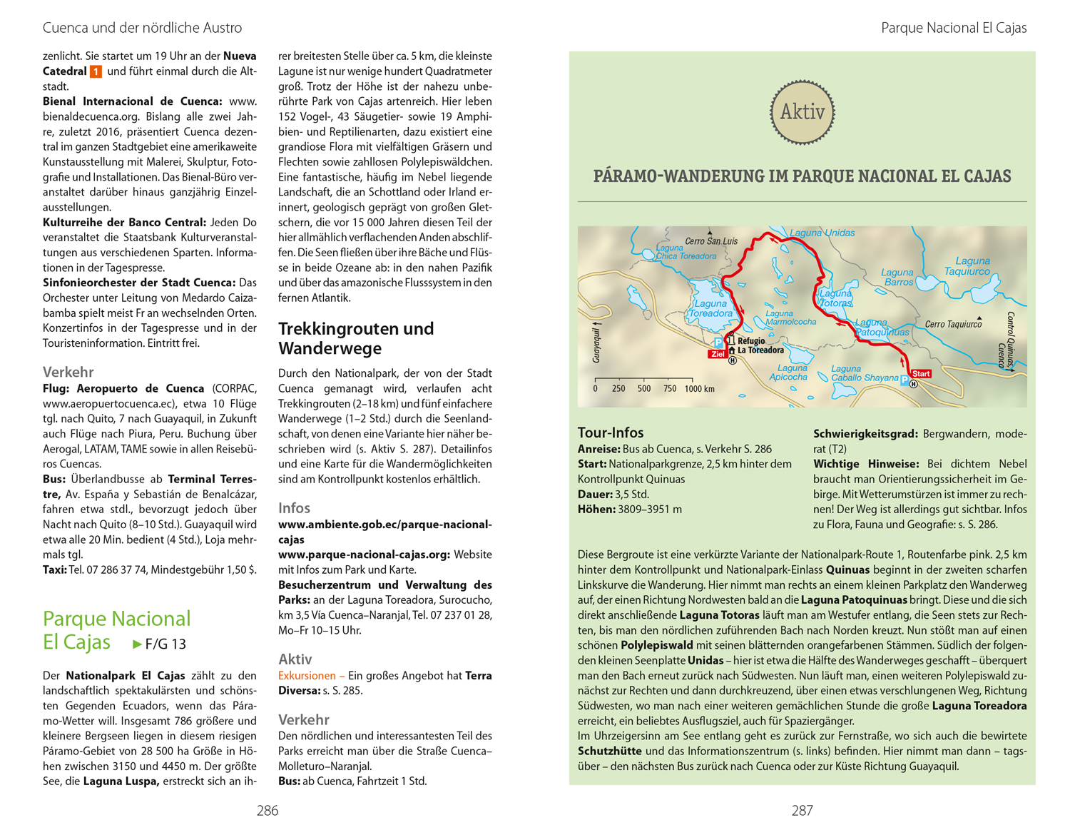 Peter Korneffel gibt den Lesern viele Anregungen für nachhaltiges Reisen und Blicke hinter die Kulissen. So stellt er Landtourismus-Projekte vor wie die Kunsthandwerkerdörfer bei Otavalo oder den Turismo Comunitario von Paquiestancia am Cayambe, der u.a. Reitausflüge mit Kondorbeobachtung organisiert. Zu jedem Kapitel präsentiert eine Doppelseite "Auf einen Blick" die Highlights, die schönsten Routen - darunter spannende Nebenstrecken -, aktive Naturerlebnisse und besondere Tipps des Autors. Ausgesuchte Unterkünfte und Restaurants mit individueller Atmosphäre sind in die Citypläne eingezeichnet, ebenso wie interessante Einkaufs- und Aktivadressen. Mit Karte versehene Wanderungen erschließen die schönsten Landschaften, etwa die großartige Bergkulisse rund um die Laguna Cuicocha. Viel Wissenswertes über Ecuador, z.B. über Geschichte und Gegenwart - bis hin zum 2017 gewählten Präsidenten Lenín Moreno -, lässt sich in der einführenden Landeskunde und auf den eingestreuten Themenseiten nachlesen.