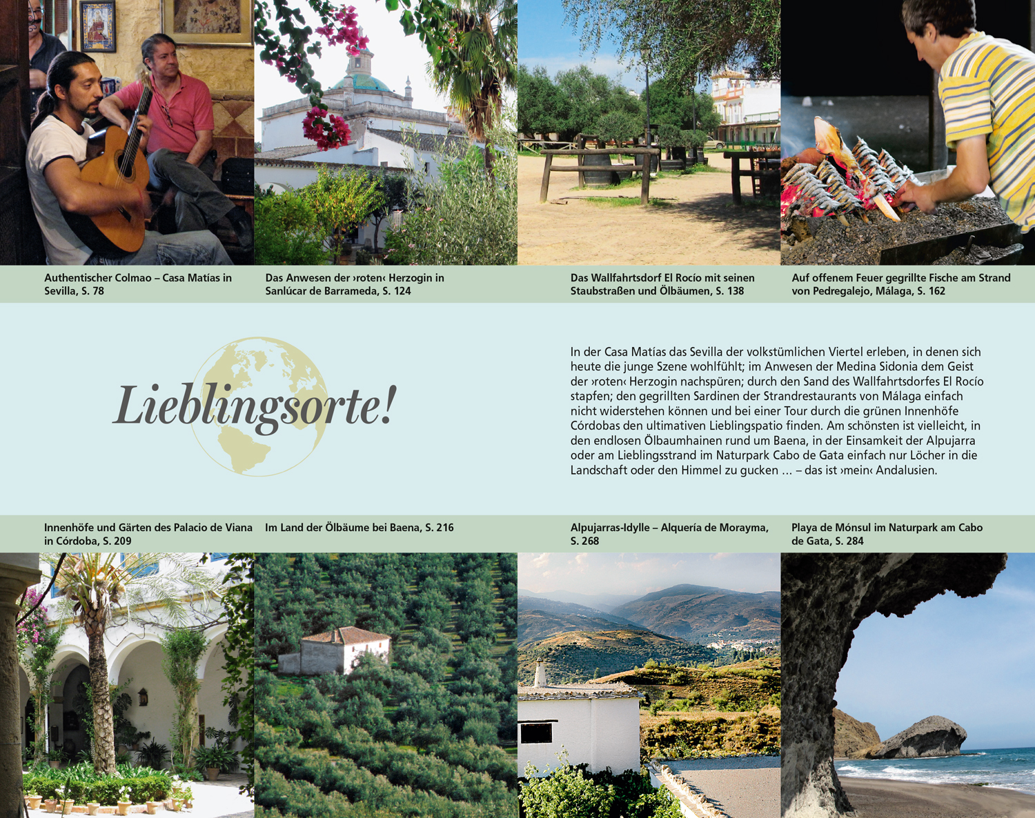 Wer besondere Facetten der andalusischen Kulturlandschaft intensiver erleben möchte, folge den zehn Entdeckungstouren. In Sevilla steht ein Grundkurs in Sachen Flamenco auf dem Programm, in Málaga der Jahrhundertmaler Picasso, in Jaén die Route des Olivenöls und in Jerez de la Frontera ein Abstecher ins Reich der Sherrybarone. Zu allen Orten gibt die Autorin eine bewertete Auswahl an empfehlenswerten Adressen und Tipps, und sie verrät immer wieder auch ihre ganz persönlichen Lieblingsorte.