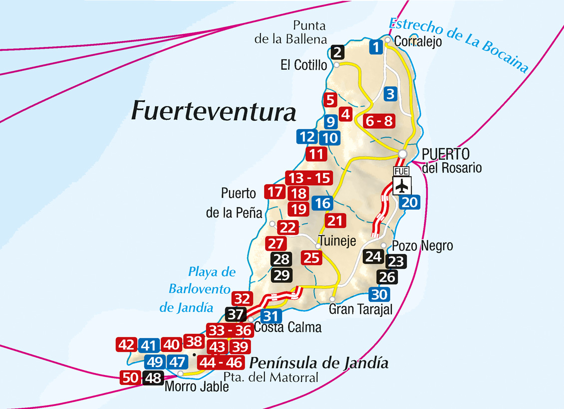 - Die nördlichen Regionen von Fuerteventura beeindrucken mit wunderschönen Dünenlandschaften, die Inselmitte lockt mit ockergelben Hügelketten und schwarzen Lavasandbuchten und im Süden liegt mit dem Pico de la Zarza (812 m) die höchste Erhebung der Insel, dazu locken traumhafte Sandstrände