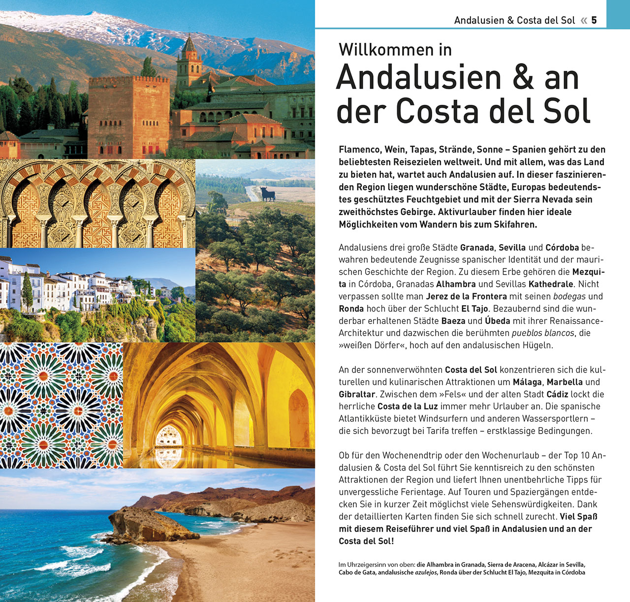 Highlights-Willkommen in Andalusien & an der Costa del Sol-Andalusien & die Costa del Sol entdecken-Highlights-Maurisches Granada: Alhambra, Generalife & Albaicín-Sevilla: Kathedrale & La Giralda-Sevilla: Real Alcázar-Córdoba-Córdoba: Mezquita-Cádiz-Ronda-Costa del Sol-Baeza & Úbeda-Parque Nacional de Doñana-Sierra NevadaThemen-Historische Ereignisse-Maurisches Erbe-Kultur der Roma-Kunst & Kultur-Alcázares, Palacios & Castillos-Sakrale Gebäude-Museen-Dörfer-Paseos, Plazas, Parks & Gärten-Naturschutzgebiete-Strände-Sport & Aktivurlaub-Wanderungen & Touren-Kinder-Spezialitäten-Tapas-Bodegas & Weinkellereien-Kostenlose Attraktionen-Religiöse FesteRegionen-Sevilla-Sevilla & Huelva-Málaga & Cádiz-Granada & Almería-Córdoba & JaénReise-Infos-Anreise & Vor Ort unterwegs-Praktische Hinweise-Hotels-Textregister-Danksagung, Bildnachweis & Impressum-Sprachführer