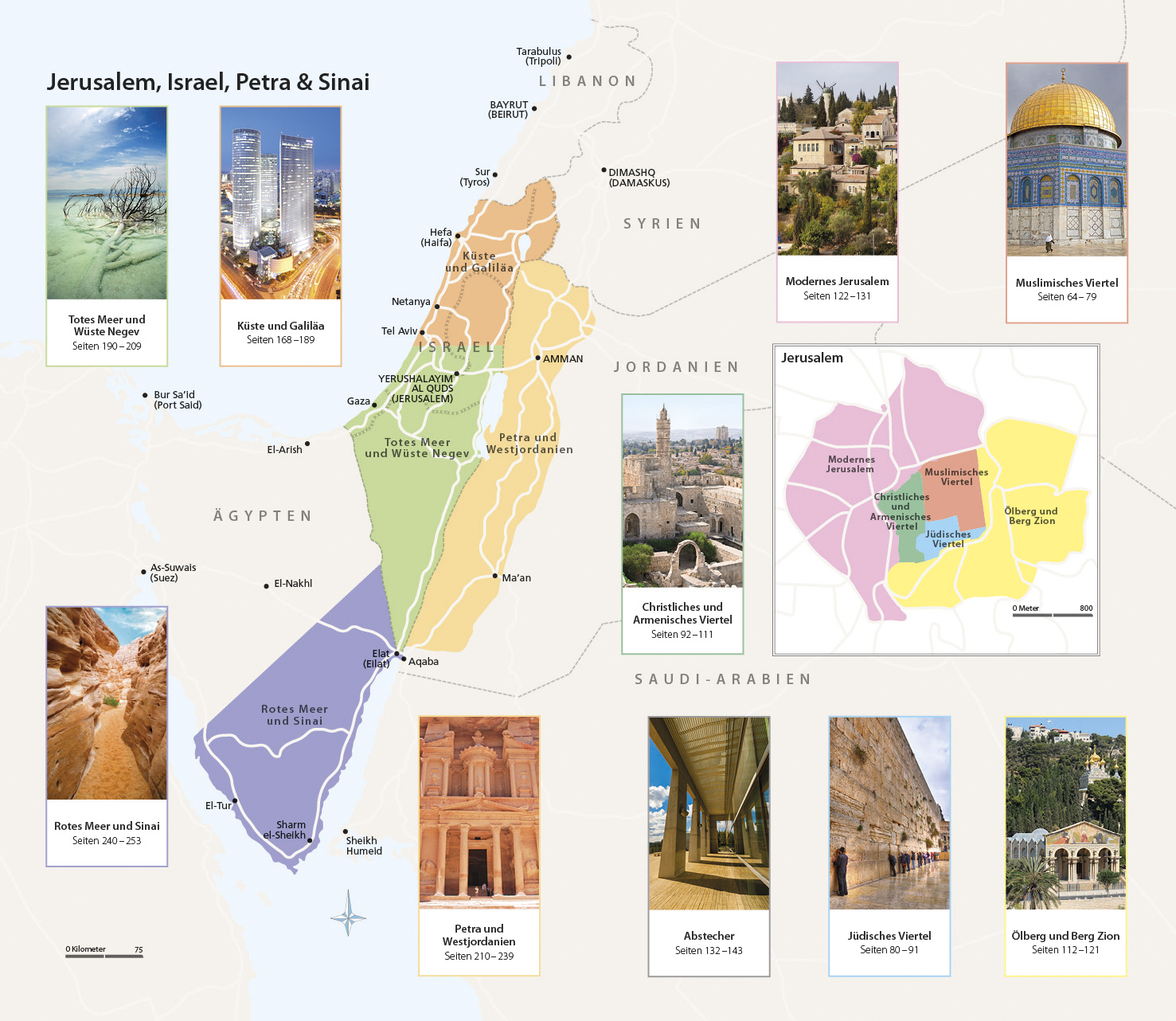 Von der Grabeskirche und dem alten Stadtviertel Yemin Moshe über die Klagemauer bis zum Ölberg: Die beeindruckende Vielfalt Jerusalems wird ebenso präsentiert wie das Tote Meer, die Wüste Negev und Westjordanien. Erkunden Sie eine spannende und geschichtsträchtige Region – Sie finden im Vis-à-Vis Jerusalem, Israel, Petra & Sinai für jedes Vorhaben alle Informationen, die Sie benötigen: