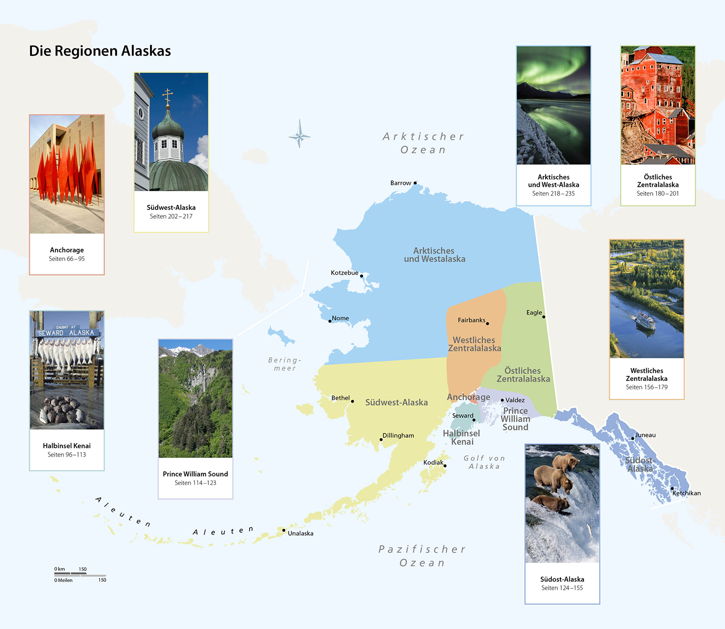 -Liebevoll gestaltete Zeichnungen vom Alaska Native Heritage Center oder vom Independence Mine State Historical Park sowie über 700 hochwertige Farbfotografien vom Crystal Lattice im Anchorage Museum oder von Polarlichtern bieten spannende Einblicke in Land, Leute und die wichtigsten Sehenswürdigkeiten.