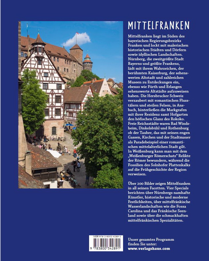 Mittelfranken liegt im Süden des bayerischen Regierungsbezirks Franken und lockt mit malerischen historischen Städten und Dörfern sowie idyllischen Landschaften. Nürnberg lädt mit ihrem Wahrzeichen, der berühmten Kaiserburg, der sehenswerten Altstadt und zahlreichen Museen zu Entdeckungen ein, ebenso wie Fürth und Erlangen reizvolle Innenstädte aufzuweisen haben. Erholung vom städtischen Ballungszentrum Mittelfrankens bietet die Hersbrucker Schweiz mit romantischen Flusstälern und steilen Felsen.Die Regierung Mittelfrankens hat ihren Sitz allerdings in Ansbach, wo die Markgrafen mit ihrer Residenz samt Hofgarten den höfischen Glanz des Rokoko hinterließen. An das Mittelalter wiederum erinnert Wolframs-Eschenbach mit dem Namen des berühmten Sängers und seinen Fachwerkhäuser sowie der Stadtmauer. Freie Reichsstädte waren Bad Windsheim, Dinkelsbühl und Rothenburg ob der Tauber, wobei letzteres mit seinen engen Gassen, Kirchen und der Stadtmauer als Paradebeispiel einer romantischen mittelalterlichen Stadt gilt. In Weißenburg kann man mit dem "Weißenburger Römerschatz" Hinterlassenschaften der Römer bewundern, während die Fossilien des Solnhofer Plattenkalks auf die Frühgeschichte der Region verweisen. Jung hingegen ist die Freizeit- und Erholungslandschaft des Fränkischen Seenlandes, das bis zum Ende des 20. Jahrhunderts entstand.Über 200 Bilder zeigen Mittelfranken in all seinen Facetten. Vier Specials berichten über Nürnbergs namhafte Künstler, historische und moderne Festlichkeiten von der Kinderzeche bis zu Rock im Park, über mittelfränkische Wasserlandschaften wie die Fossa Carolina und das Fränkische Seenland sowie über die kulinarischen Spezialitäten wie zum Beispiel Aischgründer Karpfen und Schneeballen.REISE DURCH ... ist eine Bildband-Reihe professionell fotografiert von renommierten Reisefotografen - - - Bis zu 230 Bilder auf 128 bis 140 Seiten - - - Sensationell günstiger Preis - - - Alle wichtigen Sehenswürdigkeiten - - - Kultur und Traditionen - - - Kenntnisreiche Texte - - - Ausführliche Bildunterschriften - - - Farbige Übersichtskarte - - - Detailliertes Register.