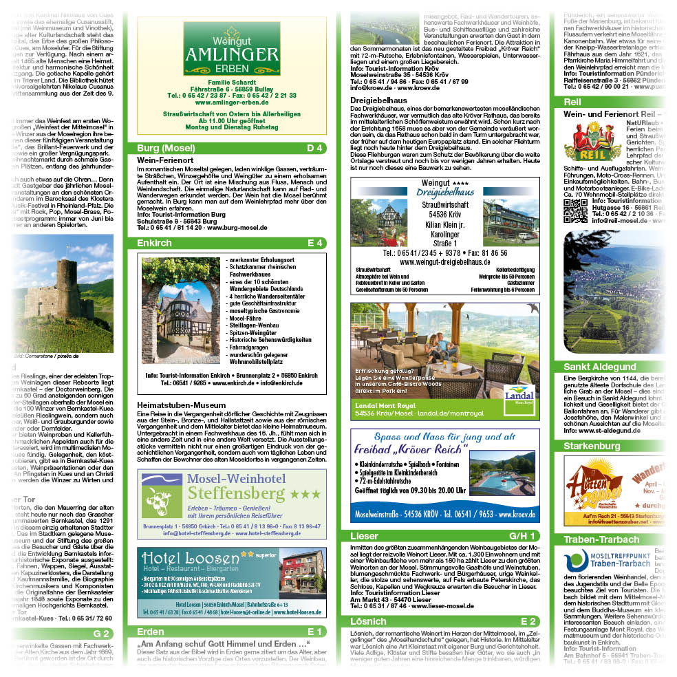 Das Gebiet der Mittelmosel ist Thema der Rad- und Wanderkarte. Auf der Karte sind nicht nur Rad- und Wanderwege entlang des Moselufers eingezeichnet, sondern auch Höhenwege in den angrenzenden Weinbergen, die mit markierten Aussichtspunkten die steilen Wegstrecken zu einem Ziel führen. Stadtpläne von Bernkastel-Kues, Kröv und Traben-Trarbach ergänzen auf der Rückseite die Infos (Ausflugstipps, Gastronomie) zu den Weinorten.