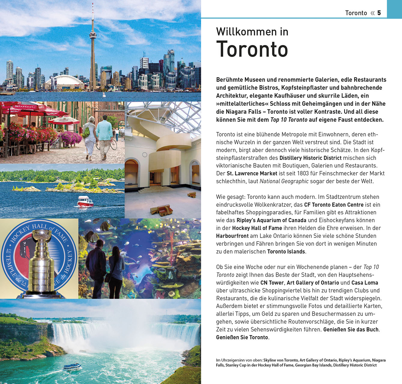 Berühmte Museen und renommierte Galerien, edle Restaurants und gemütliche Bistros, Kopfsteinpflaster und bahnbrechende Architektur, elegante Kaufhäuser und skurrile Läden, ein »mittelalterliches« Schloss mit Geheimgängen und in der Nähe die Niagara Falls: Toronto ist voller Kontraste. Entdecken Sie mit dem Top 10 Toronto den Reiz dieser Metropole hier finden Sie alle Informationen, die Sie für einen unvergesslichen Aufenthalt benötigen:
