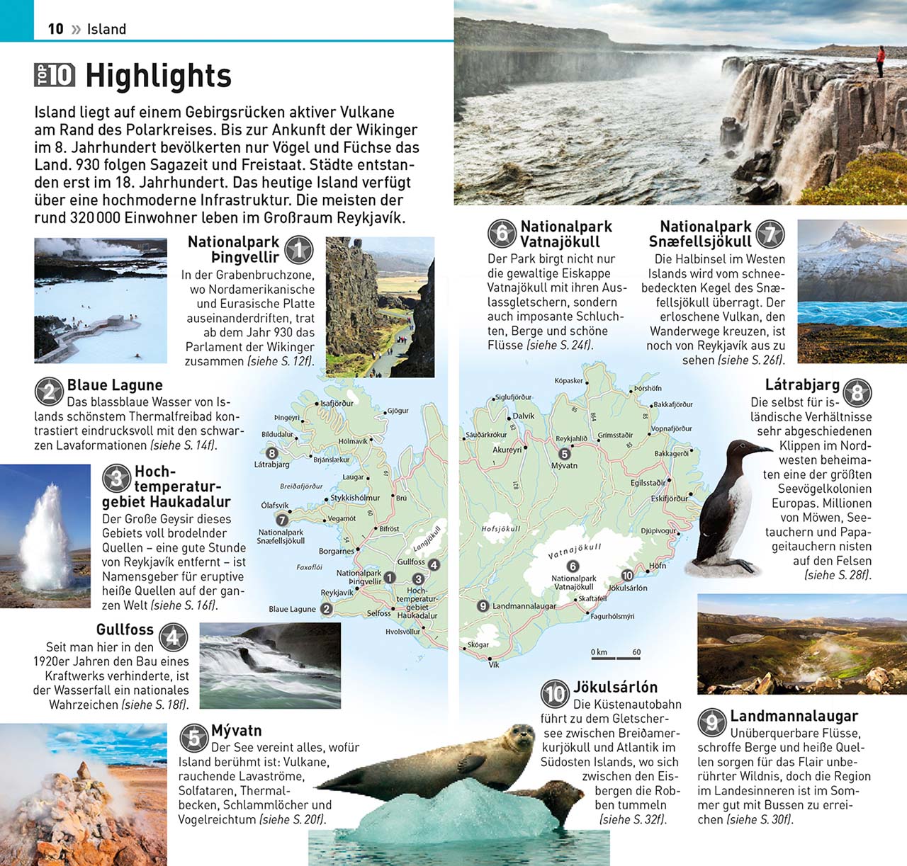 Highlights: Sie sind nur kurz in Island, wollen aber nichts verpassen? Dann sind Sie in der Rubrik "Islands Highlights" genau richtig. Hier werden Sie auf direktem Weg zu den zehn wichtigsten Sehenswürdigkeiten geführt, die jeweils auf einer Doppelseite ausführlich vorgestellt werden: von der Blauen Lagune über den Gullfoss bis zum Nationalpark Vatnajökull. Für diejenigen unter Ihnen, die nur für zwei oder sieben Tage in Island sind und die Zeit optimal nutzen wollen, bieten Tagestouren-Vorschläge eine hilfreiche Inspiration für Ihre Reiseplanung. Die Touren sind zudem auf einer übersichtlichen Karte eingezeichnet.