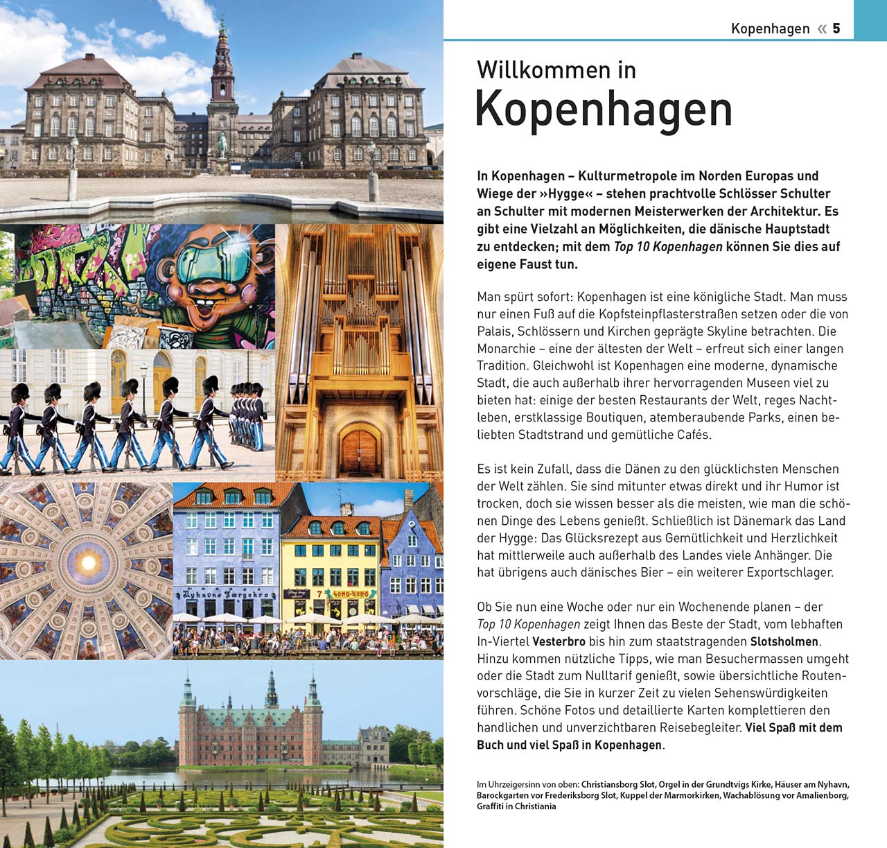 Kopenhagen ist nicht nur die kulturelle Hauptstadt Nordeuropas, von hier aus hat sich auch Hygge in alle Welt verbreitet. Dieses Lebensgefühl findet man in der charmanten und überschaubaren Stadt überall, ob in einem der vielen gemütlichen Cafés oder besonders zu Weihnachten im Tivoli mit seinen zahlreichen Lichtern. Daneben besticht die Stadt mit ihren atemberaubenden modernen Bauwerken und beeindruckenden Schhlössern und Palästen. Entdecken Sie mit dem Top 10 Kopenhagen den Reiz dieser spannenden Stadt - hier finden Sie alle Informationen, die Sie für einen unvergesslichen Aufenthalt benötigen:Highlights: Hier werden Sie auf direktem Weg zu den zehn wichtigsten Sehenswürdigkeiten der Stadt geführt: vom Vergnügungspark Tivoli über den Palastkomplex Amalienborg & Frederiksstaden bis zu Kongens Nytorv & Nyhavn, den wohl schönsten Ecken der Stadt. Wenn Sie nur für zwei oder vier Tage in Kopenhagen sind, können Sie sich von den empfohlenen Tagestouren inspirieren lassen.Themen: Falls Sie ein spezielles Interesse haben, bieten Listen zu bestimmten Themen eine ideale Grundlage für Ihre Reiseplanung: Ob zu historischen Ereignissen, Museen & Sammlungen oder kostenlosen Attraktionen und Unbekanntem.Stadtteile: Von Nørrebro und Østerbro über Vesterbro & Frederiksberg bis nach Christianshavn & Holmen - die einzelnen Stadtteile werden mit anschaulichen Karten übersichtlich und ausführlich präsentiert.Reise-Infos: Hier finden Sie praktische Hinweise zu Hotelempfehlungen, Tipps zur Anreise, zu öffentlichen Verkehrsmitteln, Sicherheit und Gesundheit sowie Geld und Kommunikation.Extrakarte zum Herausnehmen: Diese laminierte Karte mit übersichtlichen Stadtplänen erleichtert Ihnen die Orientierung vor Ort.Kulinarischer Sprachführer: Um sich auch kulinarisch in Kopenhagen zurechtzufinden, gibt es erstmals einen visuellen Sprachführer zum Thema "Speisen & Getränke" zum Herausnehmen.Erleben Sie mit dem Top 10 Kopenhagen den einzigartigen Charme dieser atemberaubenden Stadt!