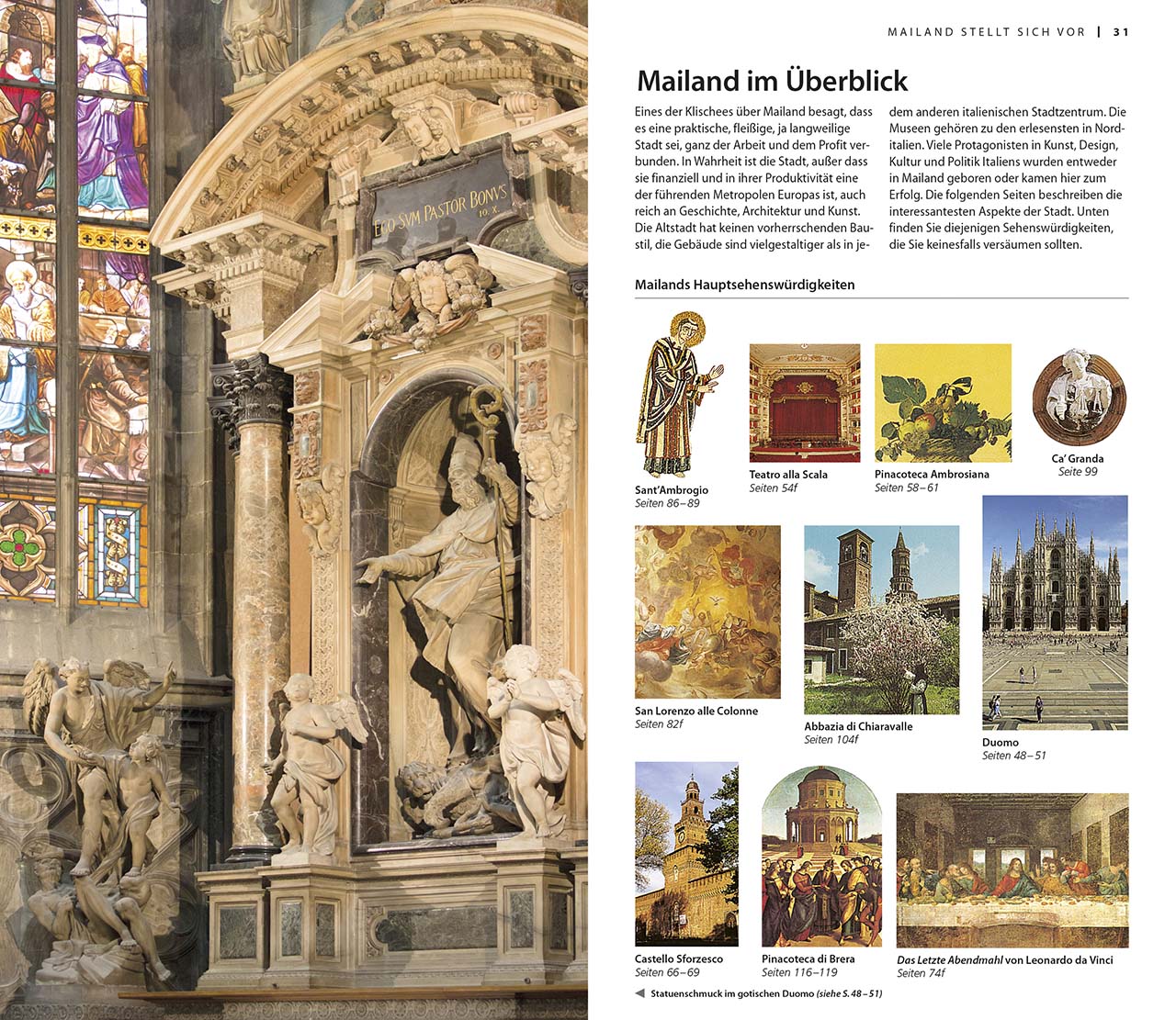 -Aufrisszeichnungen der wichtigsten Sehenswürdigkeiten, zum Beispiel vom Teatro alla Scala, San Lorenzo alle Colonne oder Abbazia di Chiaravalle