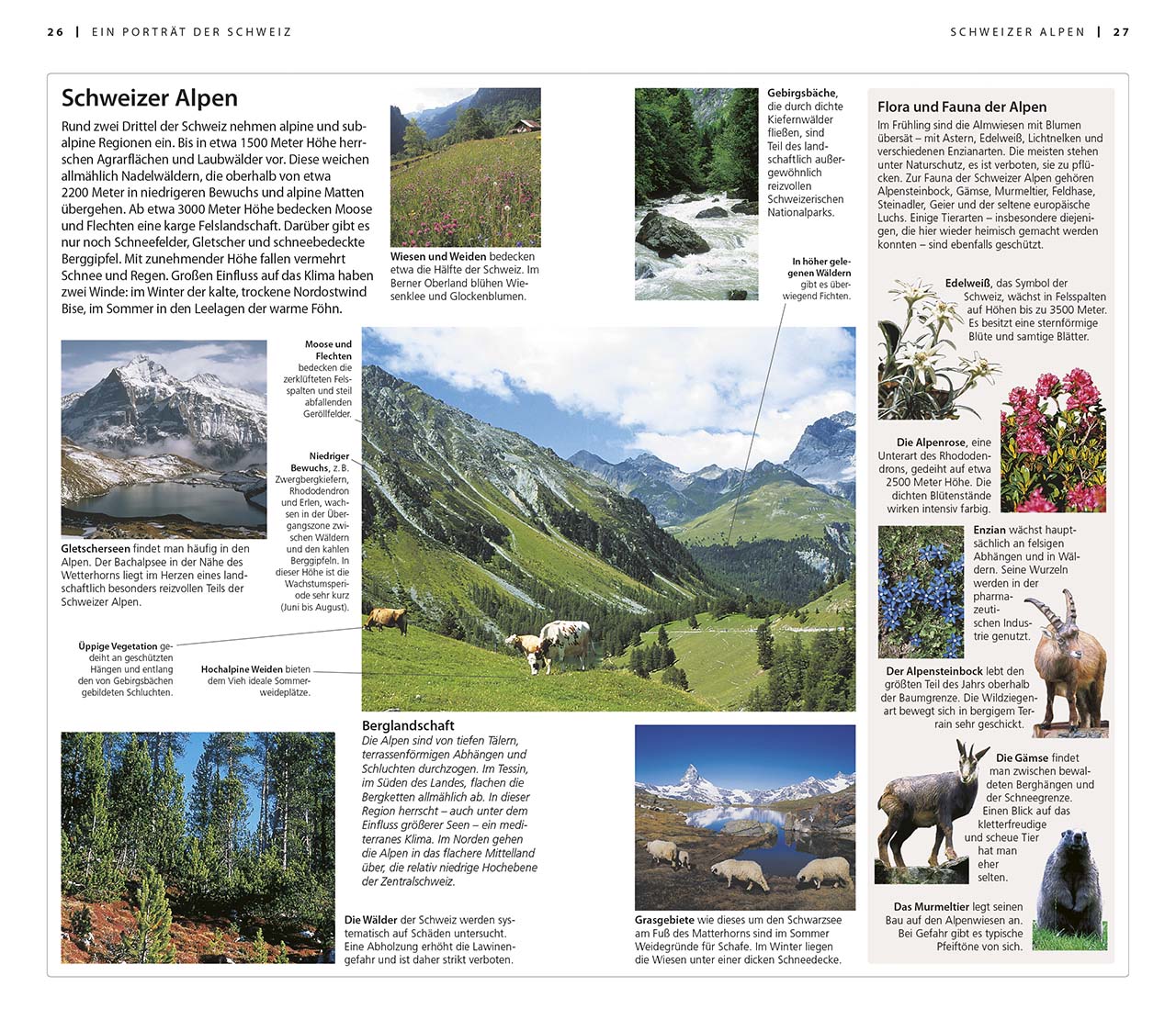 Sie finden in diesem Buch für jedes Vorhaben Informationen, die Sie benötigen: vom bezaubernden Romantikhotel in Appenzell über das regionale Spezialitäten-Restaurant in Bern bis zum Thermalbad in St. Moritz. Die bedeutendsten Städte Zürich und Genf werden ausführlich vorgestellt. Alle wichtigen Sehenswürdigkeiten wie die Cathédrale St-Pierre in Genf, das Münster in Basel oder das Kloster Einsiedeln werden anhand von Aufrisszeichnungen ausführlich beschrieben. Außerdem gibt es viele Informationen zu Wintersport und Bergsteigen.