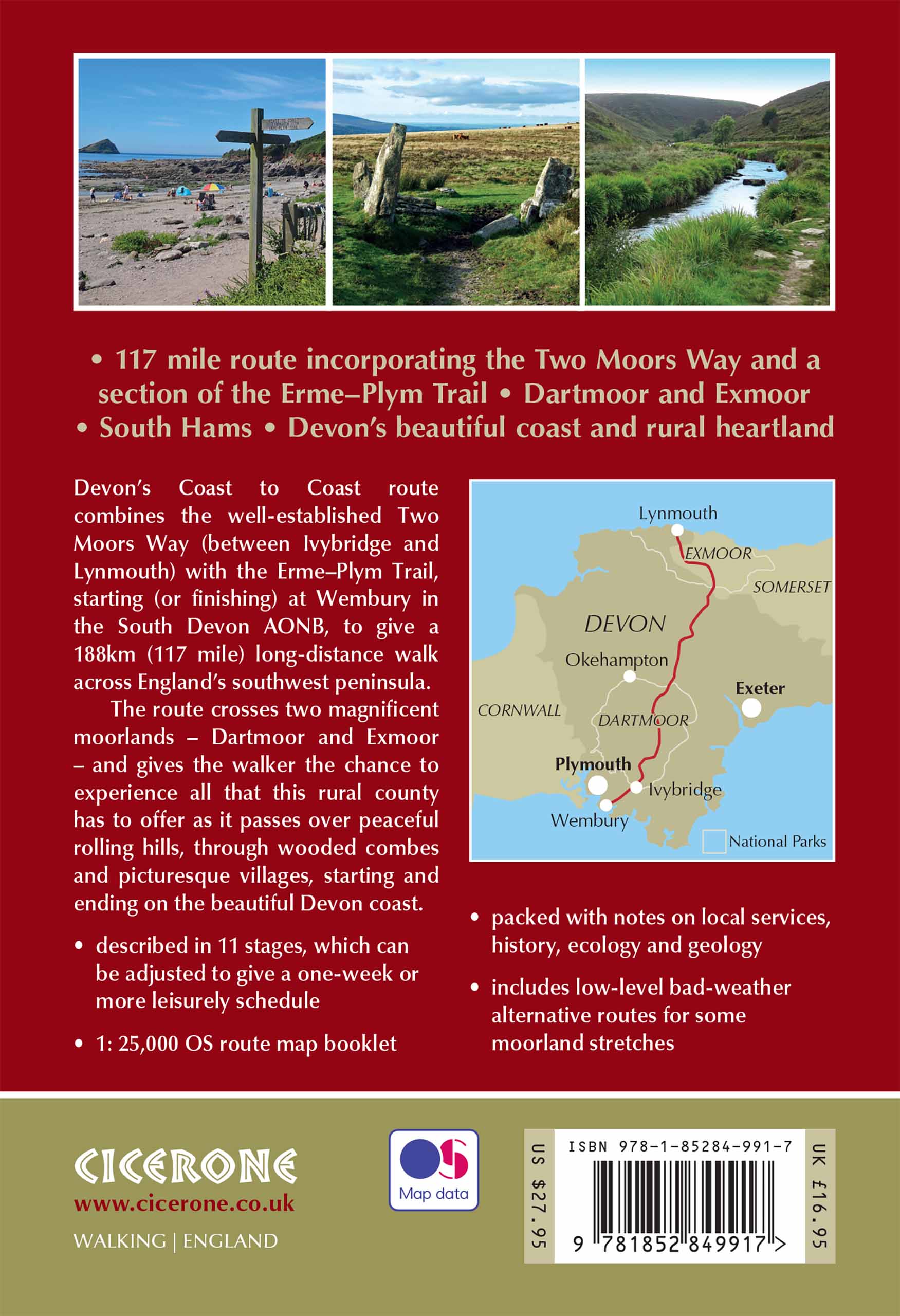 A guidebook to walking a 188km (117 mile) Coast to Coast across Devon, combining the Two Moors Way with a section of the Erme–Plym Trail. Extending from Wembury to Lynmouth, the route links the Dartmoor and Exmoor National Parks and includes sections of high moorland where navigation skills are necessary.