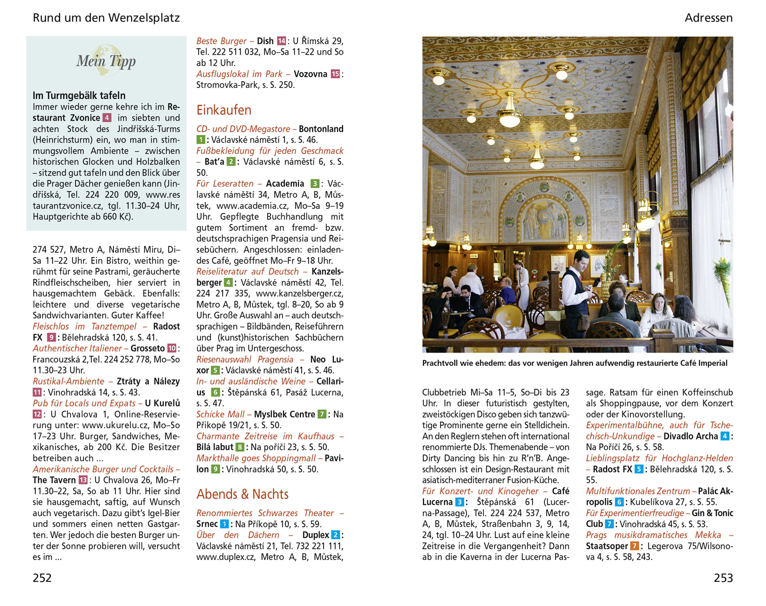 Prag persönlich. Reiseinfos, Adressen, Websites. Magazinteil (Panorama) mit Daten, Essays, Hintergründen. Altstädter Ring und östliche Altstadt. Josefov. Südliche Altstadt. Malá Strana und Prags Südwesten. Hradschin. Rund um den Wenzelsplatz. Obere Neustadt. Ausflüge in die Umgebung. Sprachführer, Kulinarisches Lexikon. 37 Karten und Pläne plus eine separate Reisekarte im Maßstab 1:11.000.