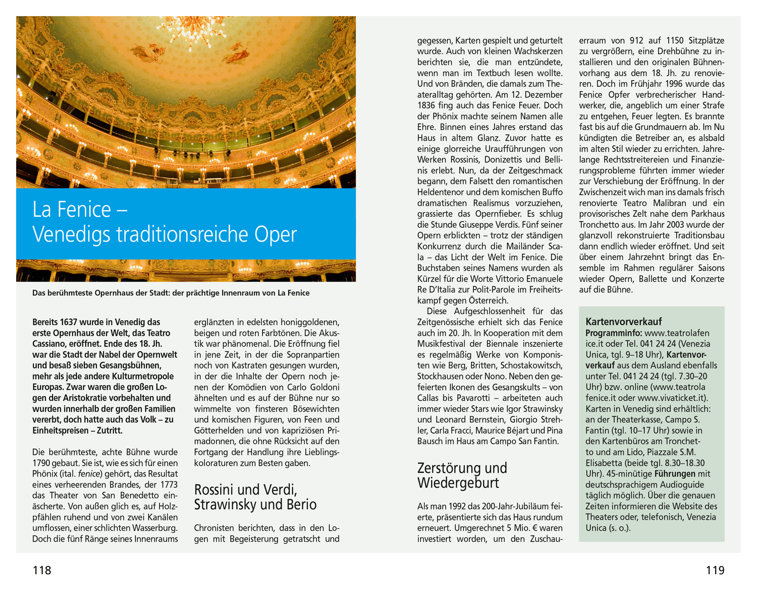 Venedig persönlich. Reiseinfos, Adressen, Websites. Magazinteil (Panorama) mit Daten, Essays, Hintergründen. Rund um den Markusplatz. San Marco. Cannaregio. Castello. San Polo und Santa Croce. Dorsoduro, San Giorgio und Giudecca. Der Lido und die Laguneninseln. Sprachführer, Kulinarisches Lexikon. 32 Karten und Pläne plus eine separate Reisekarte im Maßstab 1:5000.