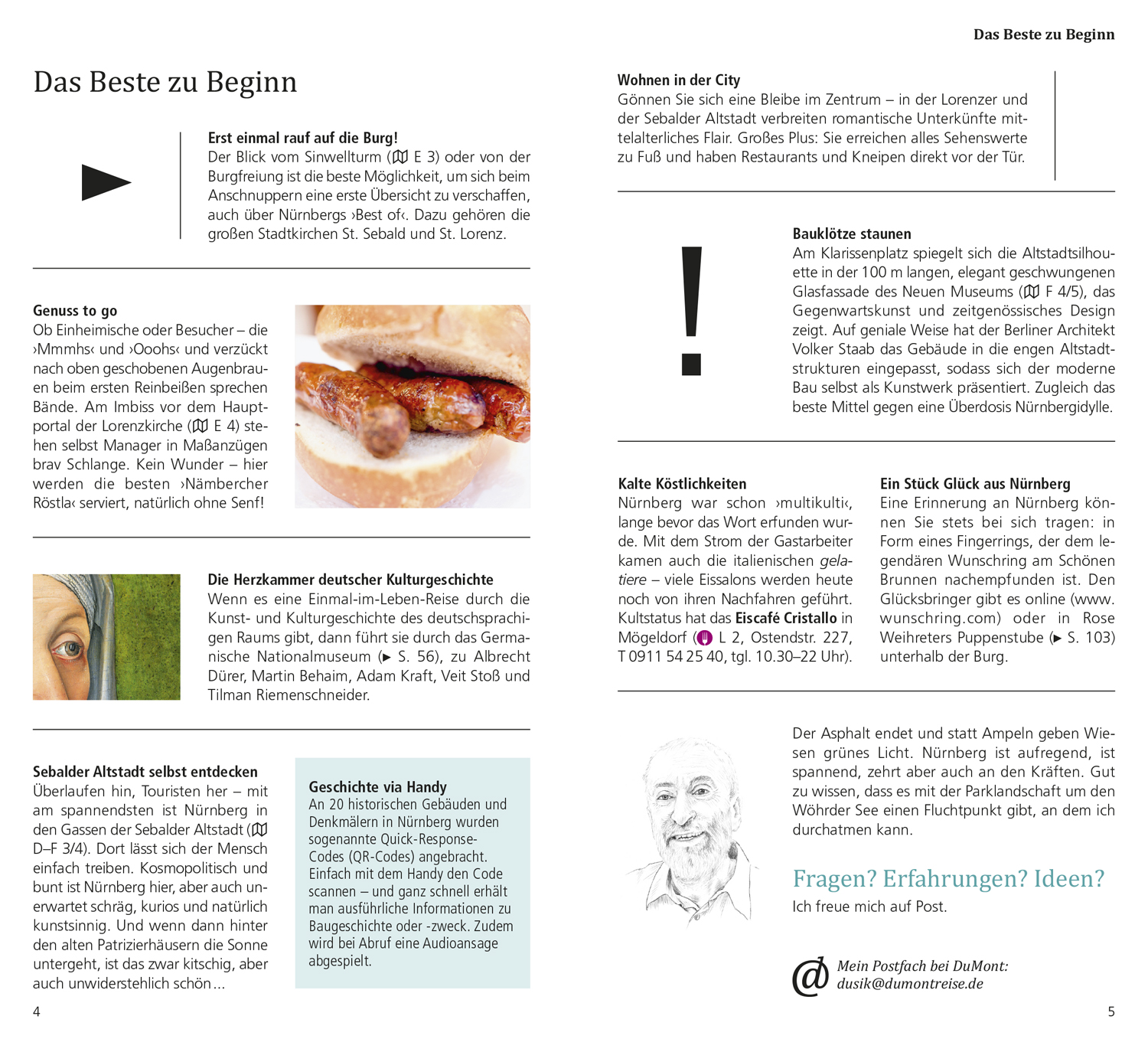 Das Beste zu Beginn. Das ist Nürnberg. Nürnberg in Zahlen. Was ist wo? Augenblicke. Ihr Nürnberg-Kompass: 15 Direktkapitel. Nürnberger Museumslandschaft. Nürnbergs Eisenbahn- und Industriegeschichte. Der "Glubb" - auf und nieder, immer wieder. Pause, einfach mal abschalten. In fremden Betten. Satt & glücklich. Stöbern & entdecken. Wenn die Nacht beginnt. Hin & weg. O-Ton Nürnberg. Kennen Sie die?