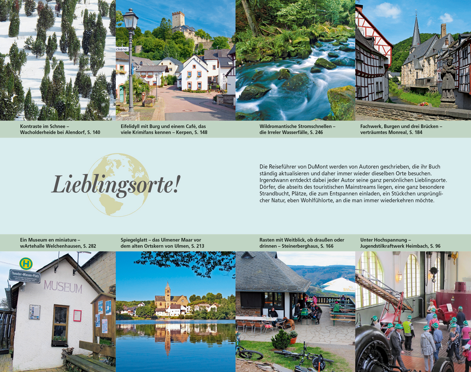 Die Eifel ist das Land der Maare und Vulkane, wo sich in tiefen Wäldern romantische Burgen verstecken und erstklassige Mineralwässer sprudeln. Die Autoren leben selbst seit 20 Jahren mitten in der Eifel und waren für die neue Auflage des DuMont Reise-Taschenbuchs Eifel in ihrer Region viel unterwegs, und zwar grenzenlos und länderübergreifend, auch in Belgien und Luxemburg. Dabei haben sie viel entdeckt, das eher abseits der ausgetretenen Pfade liegt, wie eine Eisdiele in der Westeifel oder einen Wanderweg auf den Spuren des Schwarzstorchs in der Nordeifel.