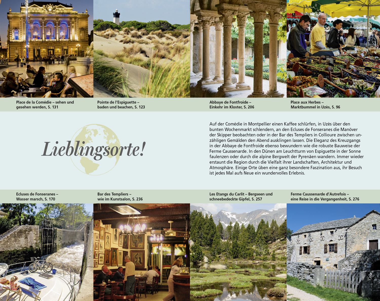 Zehn Entdeckungstouren machen vertraut mit den Traditionen der Camargue, mit Austernzucht und Salzgewinnung ebenso wie mit der geheimnisvollen Unterwelt der Causses. Wer den Süden Frankreichs aktiv erkunden möchte, folgt den beschriebenen Routen etwa durch die Schluchten des Caroux im Haut-Languedoc oder zu Gebirgsseen in den Pyrenäen, durch die amphibische Welt des Etang de Bages oder auf dem Wasser von Ardeche und Tarn.