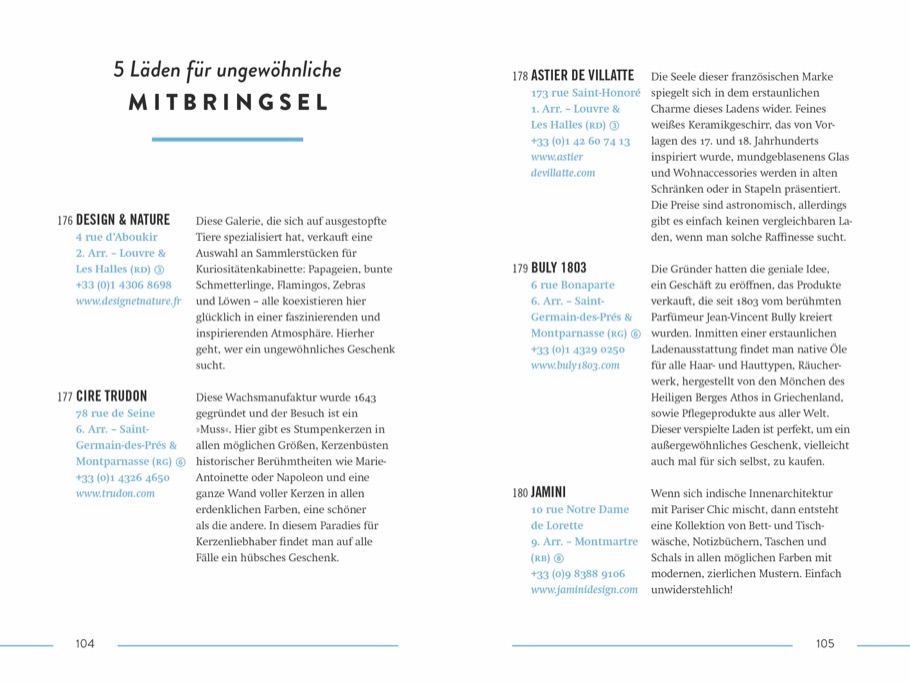 | Schlagworte | Entdecken • Erleben • Essen • für junge Leute • Geheim-Tipps • hip und urban • Insider • Insider-Tipps • Karte • lieblings-orte • mal anders • Paris entdecken top five • Paris Reiseführer 2018 • paris und umgebung • Restaurants • Shopping • Stadtführer • stadt-plan • Stadtteile • Style • Top 10 Adressen • Top ten cafes |