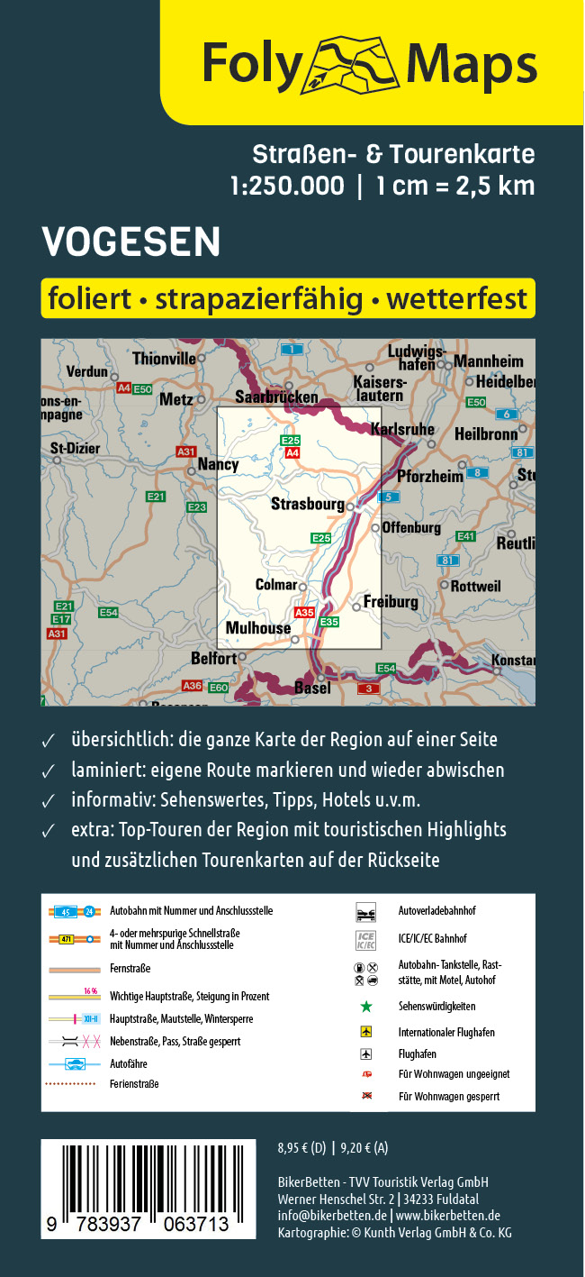 | Schlagworte | Cabrio • Elsass • foliert • FolyMaps • Frankreich • Laminiert • Lothringen • Motorrad • Motorradkarte • Motorradkarten • Motorradreiseführer • Motorrad Reiseführer • Roadtrip • Road Trip • Route des Crêtes • Straßenkarte • Touren • Vogesen |