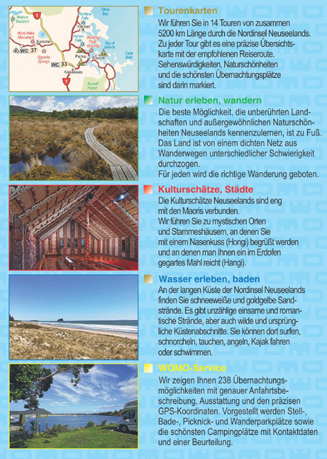 TOURENKARTENWir führe Sie in 14 Touren von zusammen 5200km Länge durch die Nordinsel Neuseelands.Zu jeder Tour gibt es eine präzise Übersichtskarte mit der empfohlenen Reiseroute. Sehenswürdigkeiten, Naturschönheiten und die schönsten Übernachtungsplätze sind darin markiert.Natur erleben, wandernDie beste Möglichkeit, die unberührten Landschaften und außergewöhnlichen Naturschönheiten Neuseelands kennenzulernen, ist zu Fuß. Das Land ist von einem dichten Netz aus Wanderwegen unterschiedlicher Schwierigkeit durchzogen. Für jeden wird die richtige Wanderung angeboten. KULTURSCHÄTZE, STÄDTEDie Kulturschätze Neuseelands sind eng mit den Maoris verbunden. Wir führen Sie zu mystischen Orten und Stammeshäusern andenen Sie mit einem Nasenkuss (Hongi) begrüßt werden und denen man Ihnen ein im Erdofen gegartes traditionelles Mahl reicht (Hangi).BADENAn der langen Küsten der Nordinsel Neuseelands finden Sie schneeweiße und goldgelbe Sandstrände. Es gibt unzählige einsame und romantische Strände, aber auch wilde und ursprüngliche Küstenabschnitte.Sie können dort surfen, schnorcheln, tauchen, angeln, Kajak fahren oder schwimmen. WOMO-SERVICEWir zeigen Ihnen 238 Übernachtungsmöglichkeiten mit genauer Anfahrtsbeschreibung, Ausstattung und präzisen GPS Koordinaten. Vorgestellt werden Stell-, Bade-, Picknick- und Wanderplätze sowie die schönsten Campingplätze mit Kontaktdaten und einer Beurteilung.