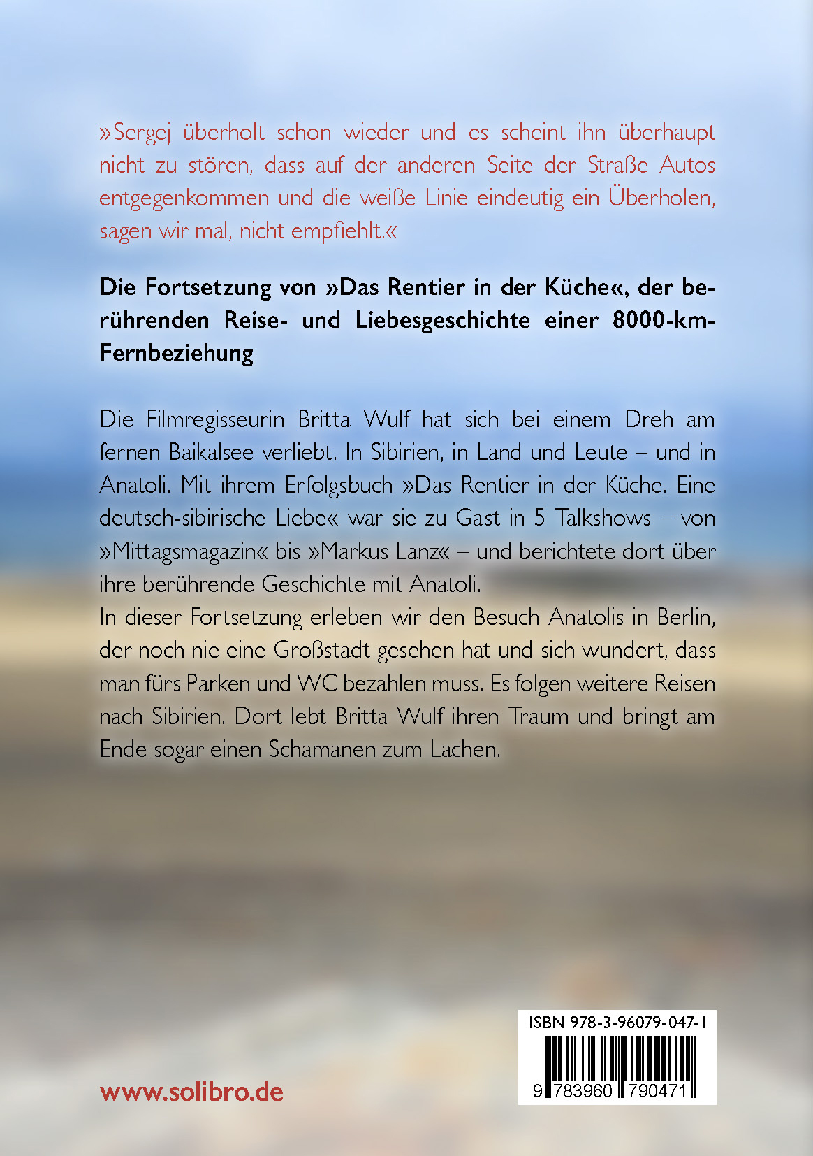 Die Filmregisseurin Britta Wulf hat sich bei einem Dreh am fernen Baikalsee verliebt. In Sibirien, in Land und Leute - und in Anatoli. Mit ihrem Erfolgsbuch "Das Rentier in der Küche. Eine deutsch-sibirische Liebe" (5. Auflagen) war sie zu Gast in 5 Talkshows - von "Mittagsmagazin" bis "Markus Lanz" - und berichtete dort über ihre berührende Geschichte mit Anatoli.