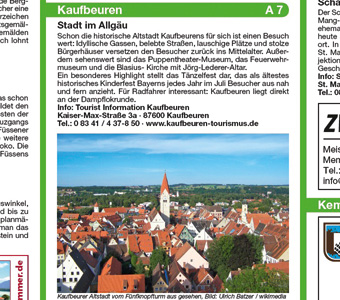 Die Radkarte Allgäu führt durch die wunderschöne Landschaft der Voralpen. Die märchenhafte Landschaft Ludwigs II. wird bestimmt von sehenswerten Städte wie Kempten, Füssen, Kaufbeuren oder Wangen und den zahlreichen Seen. Auch wenn hier im Voralpenland starke Steigungen zu den Touren dazugehören wird man für die Mühen mit tollen Ausblicken auf den Rand der Tiroler und Allgäuer Alpen belohnt. Infos zu Orten und Gastronomie finden sich auf der Rückseite der Radwanderkarte Allgäu.