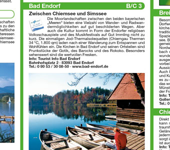 Der Chiemsee bildet den Mittelpunkt der Karte. Ufernahe Rad- und Wanderwege lassen ihn erkunden, führen zu Schiffsanlegern, um Herren- und Fraueninsel zu besuchen. Kondition erfordern die Strecken durch die schroffen Chiemgauer Alpen (über 1.000 m ü. NN). Weitere auch themenbezogene Routen führen weiter westlich entlang des Inn oder durch die hügelige Landschaft nördlich des Sees. Welche Ausflüge sich in dieser Urlaubsregion anbieten, kann man im Infoteil nachlesen.