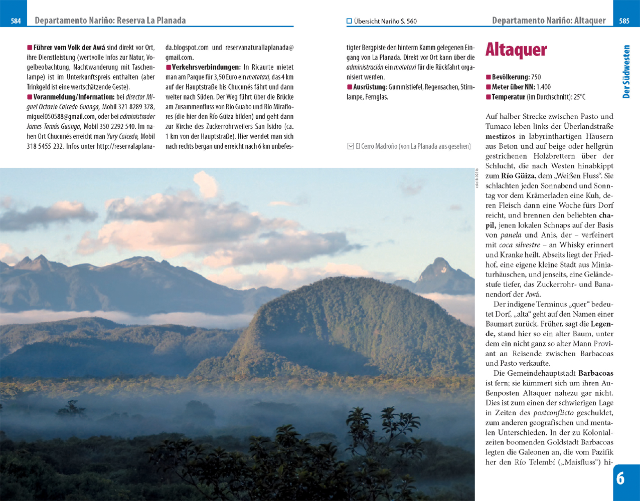 Inhalt:Vorwort 4Steckbrief Kolumbien 5Kartenverzeichnis 10Verzeichnis der Exkurse 11Reiseziele in Kolumbien 12Hinweise zur Benutzung 13Die Regionen im Überblick 15Cundinamarca - das Herz 18Bogotá (Distrito Capital) 21Bogotá 22Departamento Cundinamarca 66Zipaquirá 68Nemocón 73Laguna de Guatavita 74Guaduas 77Termales Aguas Calientes 83Die Ostkordillere - nach Venezuela 86Departamento Boyacá 88Tunja 89Paipa 101Sogamoso 104Monguí 106Iza 107Villa de Leyva 108Santuario de Iguaque 122Ráquira 122La Candelaria 123Chiquinquirá 123Muzo 127Quípama 129Smaragdminen am Río Itoco 130Otanche 131Smaragdminen von Coscuez 134Puerto Boyacá 135Departamento Santander 139Bucaramanga 140Girón 147P. N. del Chicamocha (Panachi) 149San Gil 149Charalá 155Barichara 157Guane 161Departamento Norte de Santander 163Cúcuta 164Villa del Rosario 169Pamplona 172Departamento Cesar 179Valledupar 180Eco Parque Los Besotes 185La Mina 186Nabusimake 187Der karibische Norden 190Departamento La Guajira 193Riohacha 196Santuario Los Flamencos 199Palomino 200Uribia 202Manaure 203Nazareth 204Serranía de Macuira 205Punta Gallinas 206Cabo de la Vela 206Departamento Magdalena 209Santa Marta 210El Rodadero 220Minca 222Aracataca 225Zona Bananera (Prado Sevilla) 227Taganga 227Parque Nacional Tayrona 229Los Naranjos - Guachaca - Buritaca 234Sierra Nevada de Santa Marta 236Departamento Atlántico 240Barranquilla 240Puerto Colombia 255Departamento Bolívar 257Cartagena de Indias 257La Boquilla 287Volcán de Lodo El Totumo 288Jardín Botánico Guillermo Piñeres 290Palenque de San Basilio 290Mompós (Mompox) 293Isla de Barú 303Islas del Rosario 305Islas de San Bernardo 306Isla Fuerte 311Departamento Sucre 314Sincelejo 314Tolú 316Departamento Córdoba 319Montería 319Lorica 322San Antero 324Paso Nuevo 325Río Cedro 325Puerto Escondido 326Isla Tortuguilla 327Inhalt 7Departamento San Andrés y Providencia 328Isla San Andrés 333Isla Providencia & Isla Santa Catalina 342El Chocó 348Departamento Chocó 350Quibdó 351Tutunendó 357Capurganá 357Sapzurro 362Bahía Solano (Ciudad Mutis) 363El Valle 365Ensenada de Utría 369Antioquia & Kaffeezone 370Departamento Antioquia 373Medellín 375Santa Fe de Antioquia 399Turbo 406Necoclí 408Arboletes 409Venecia 411Hacienda Fizebad 412El Retiro 413La Ceja del Tambo 414El Carmen de Viboral 414Rionegro 415Marinilla 418El Embalse del Peñol - Guatapé 418Río Claro 420Puerto Triunfo 423Departamento Caldas 427Manizales 428Departamento Risaralda 433Pereira 433Termales San Vicente 436Marsella 436Departamento Quindío 438Armenia 439Filandia 444Parque Nacional del Café 445Salento 446Valle de Cocora 449Parque Nacional Los Nevados 450Der Südwesten 454Departamento Tolima 457Ibagué 460Nevado del Tolima 463El Espinal 465Armero-Guayabal 466Ambalema 467Mariquita 468Honda 474Departamento Huila 479Neiva 481Villavieja 487Desierto de la Tatacoa 489Rivera 491Timaná 491San Agustín 492Departamento Valle del Cauca 507Cali 509Pance 524Palmira 526La Buitrera/Nirvana 528Hacienda El Paraíso 530Hacienda Piedechinche 530Buga 531Valle de la Guadalajara 536Laguna de Sonso 537Roldanillo 538Isla Malpelo 539Departamento Cauca 541Popayán 543Silvia 550Tierradentro 551Isla Gorgona 557Departamento Nariño 561Pasto 566Laguna de la Cocha 574Volcán Galeras 575Túquerres 578Volcán El Azufral 580Ricaurte 582Reserva La Planada 582Altaquer 585Reserva Río Ñambí 587Ipiales 590Santuario de Las Lajas 592Amazonia - der Dschungel 594Departamento Putumayo 596Valle de Sibundoy 597Termales El Salado 601Departamento Amazonas 603Leticia 603Orinoquia - die Savanne 612Departamento Meta 614Villavicencio 615Restrepo 623Cumaral 624Acacías 624Castilla La Nueva 624Cubarral 625San Martín de los Llanos 625Granada 626San Juan de Arama 629Puerto Santander 632Puerto López 633Puerto Gaitán 635Departamento Casanare 637Yopal 641Villanu