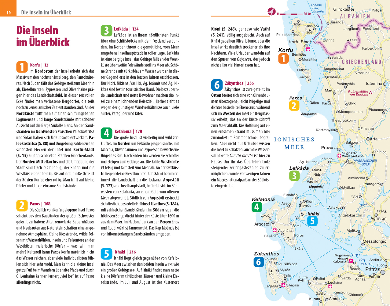 Folgen Sie der Autorin nach Korfu, der Wanderinsel mit kilometerlangen Sandstränden, herrlichen Steilküsten, alten Bergdörfern, abgelegenen Klöstern und der geschichtsträchtigen Inselhauptstadt. Entdecken Sie die spektakuläre Felsenwelt im Inselwesten von Zákynthos und genießen Sie atemberaubende Ausblicke auf die sanften mit Macchia, Olivenbäumen und Zypressen bewachsenen Hügeln auf Kefaloniá. Folgen Sie den Spuren von Odysseus auf Itháki oder erleben Sie die wilde Küste von Paxos mit ihren Wasserhöhlen und Felstoren und das türkisblaue Wasser auf Lefkáda (Lefkas), dessen günstige Windverhältnisse für Surfer, Paraglider und Kiter ideal sind.