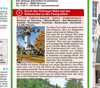Die Motorradkarte Thüringer Wald präsentiert 6 Touren, die über schmale, kurvenreiche Straßen führen und durch lange Waldstrecken und viele Aussichtspunkte insbesondere für geübte Biker reizvoll sind. Der Rennsteig bei Oberhof führt bis auf 944 m ü. NN. Die Region lockt mit Handwerken wie Glas oder Porzellan, aber auch mit sportlichen Aktivitäten im Sportzentrum Oberhof. Viele spezielle Infos für Biker ergänzen die Tourenbeschreibungen.