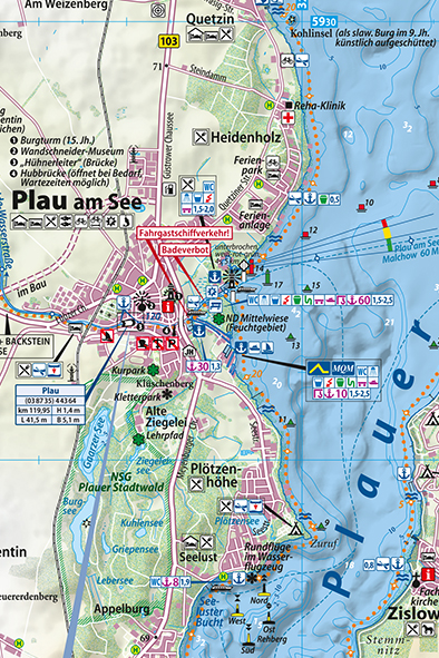 Unser handliches Taschenformat, gefaltet 10 x 15 cm passt es in jede Hemdentasche. Dank Maßstab 1:50.000 viel Karte auf handlichem Blatt. Müritz, Kölpinsee, Fleesensee und Plauer See werden auch als Oberseen oder Große Seen bezeichnet. Sie sind das Zentrum der Mecklenburgischen Seenplatte und ein Muss für jeden Bootsfahrer. Unsere aktualisierte Karte umfasst genau diese Seen. Sie enthält alle Informationen, die zum Befahren dieser Gewässer notwendig sind, wie Betonnung, Befeuerung, Infrastruktur und auch Tiefenlinien. Darüber hinaus gibt es von Kennern für die Müritz spezielle Informationen für Segler, die das Befahren des manchmal schwierigen Reviers erleichtern. Dazu gehören bspw. Angaben zu Windverhältnissen oder nicht gekennzeichneten Verblockungen. Die Karte ist GPS-geeignet.