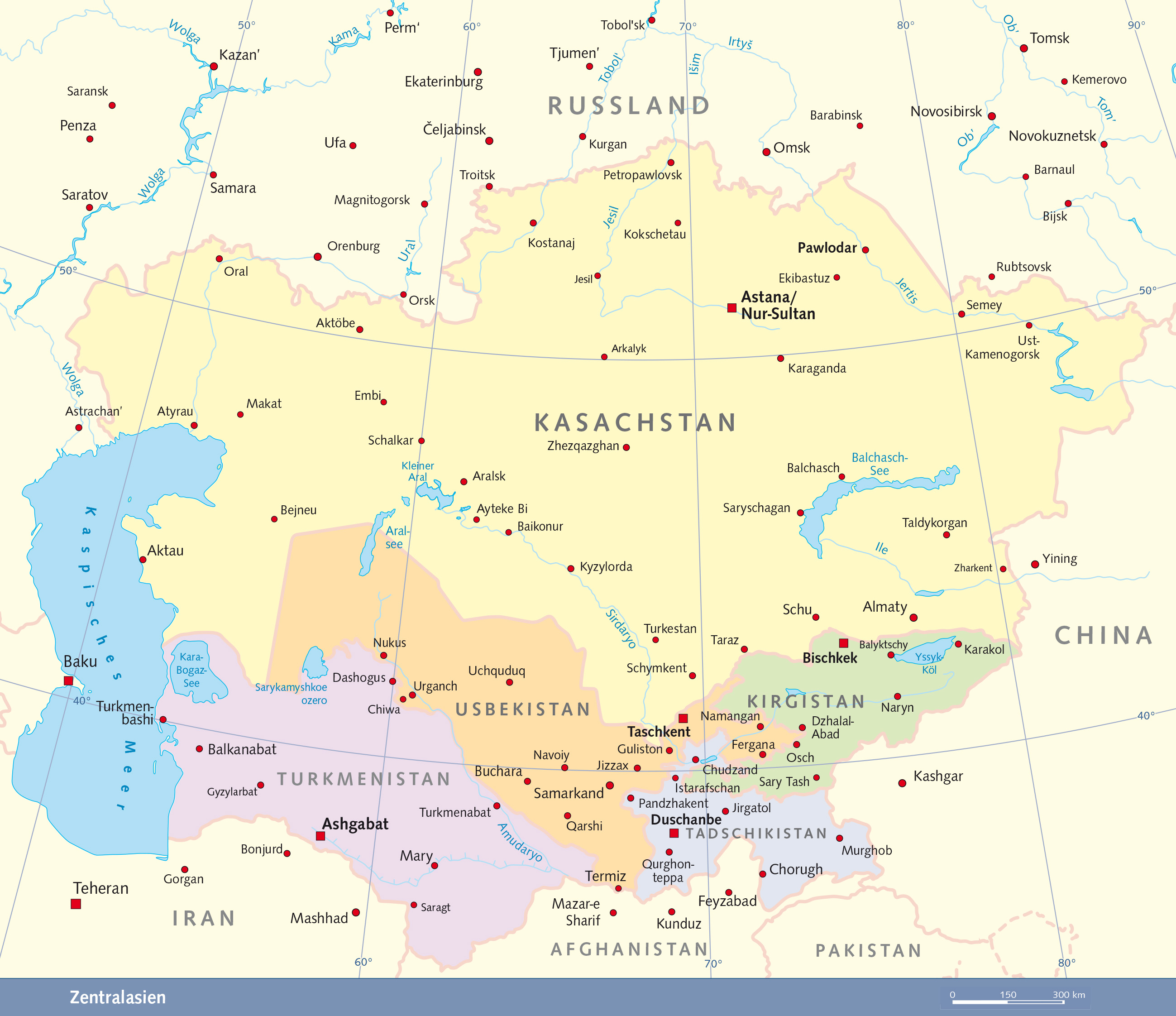 - Turkestan, Osch, Taschkent, Samarkand, Buchara, Chiwa, Merw und Konya Urgentsch