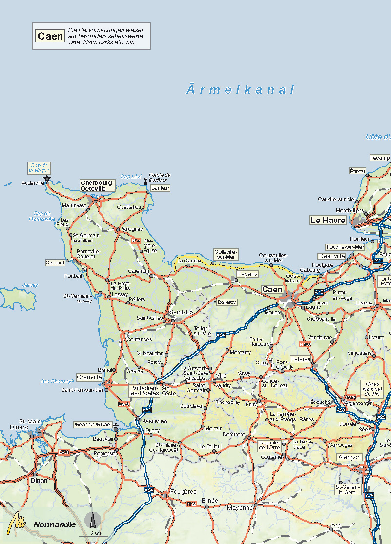 Die Côte dAlbâtre, die Alabasterküste zwischen Étretat und Dieppe, begeistert mit spektakulären weißen Kreideklippen. Sehenswert die uralte Hafenstadt Fécamp mit mächtiger Abteikirche. Die Heimat des Calvados bietet neben dem süffigem Apfelbranntwein Sehenswertes wie die Seebäder Deauville und Trouville.